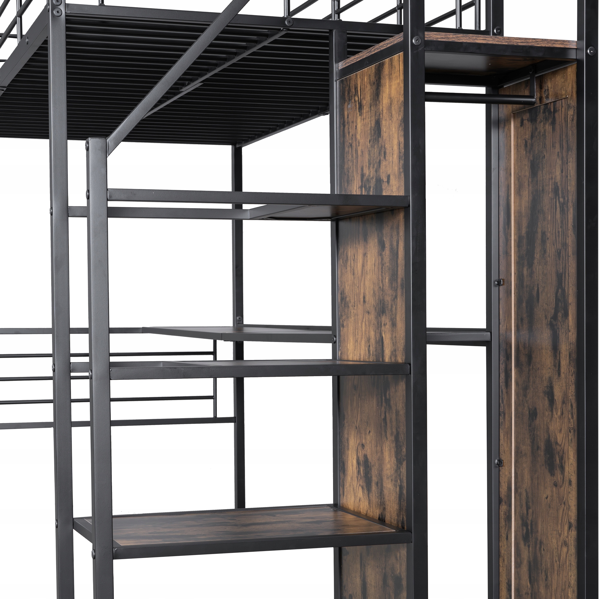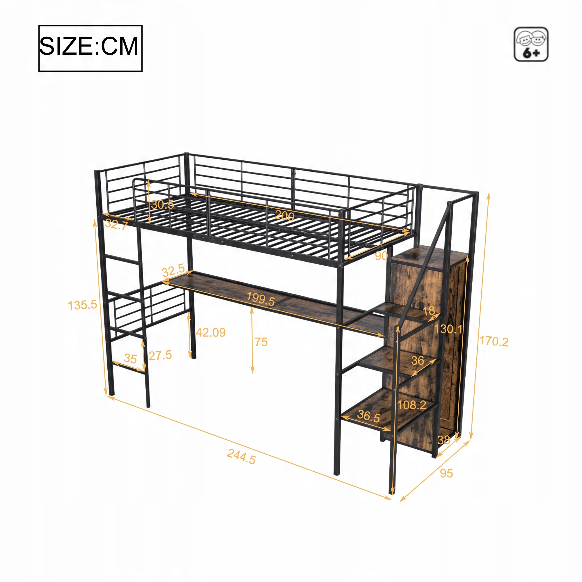 кровать на мезонине, 90*200 см, без матраса, стола, открытый гардероб, ступени хранения, железная рама, черный