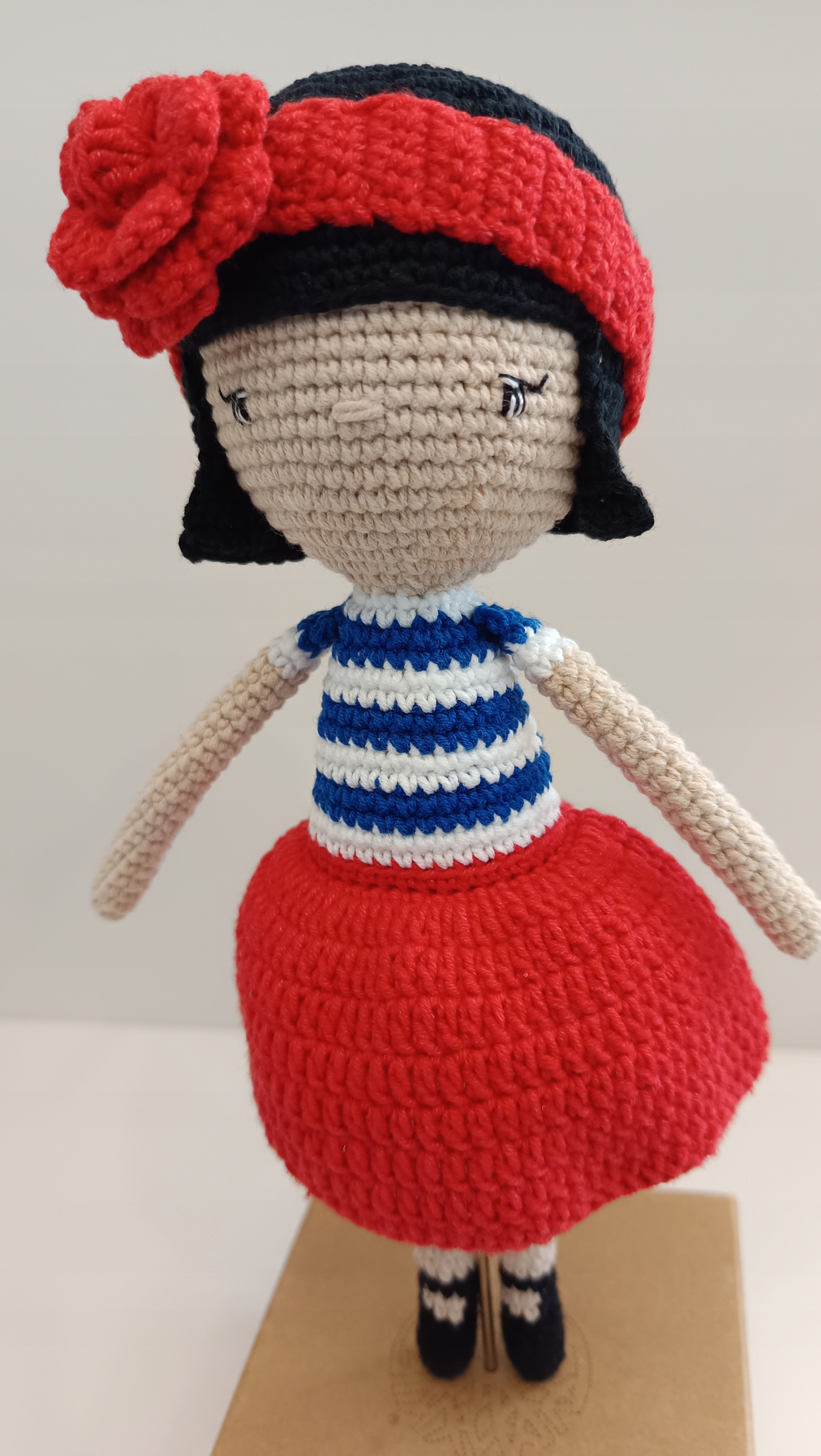 Я должен продать талисман, сделанный ручным вязанием крючком. Общая высота составляет 29 см. Он изготовлен из хлопковой пряжи, наполненной полиэфирной вставкой, глаза и нос были вышиты.