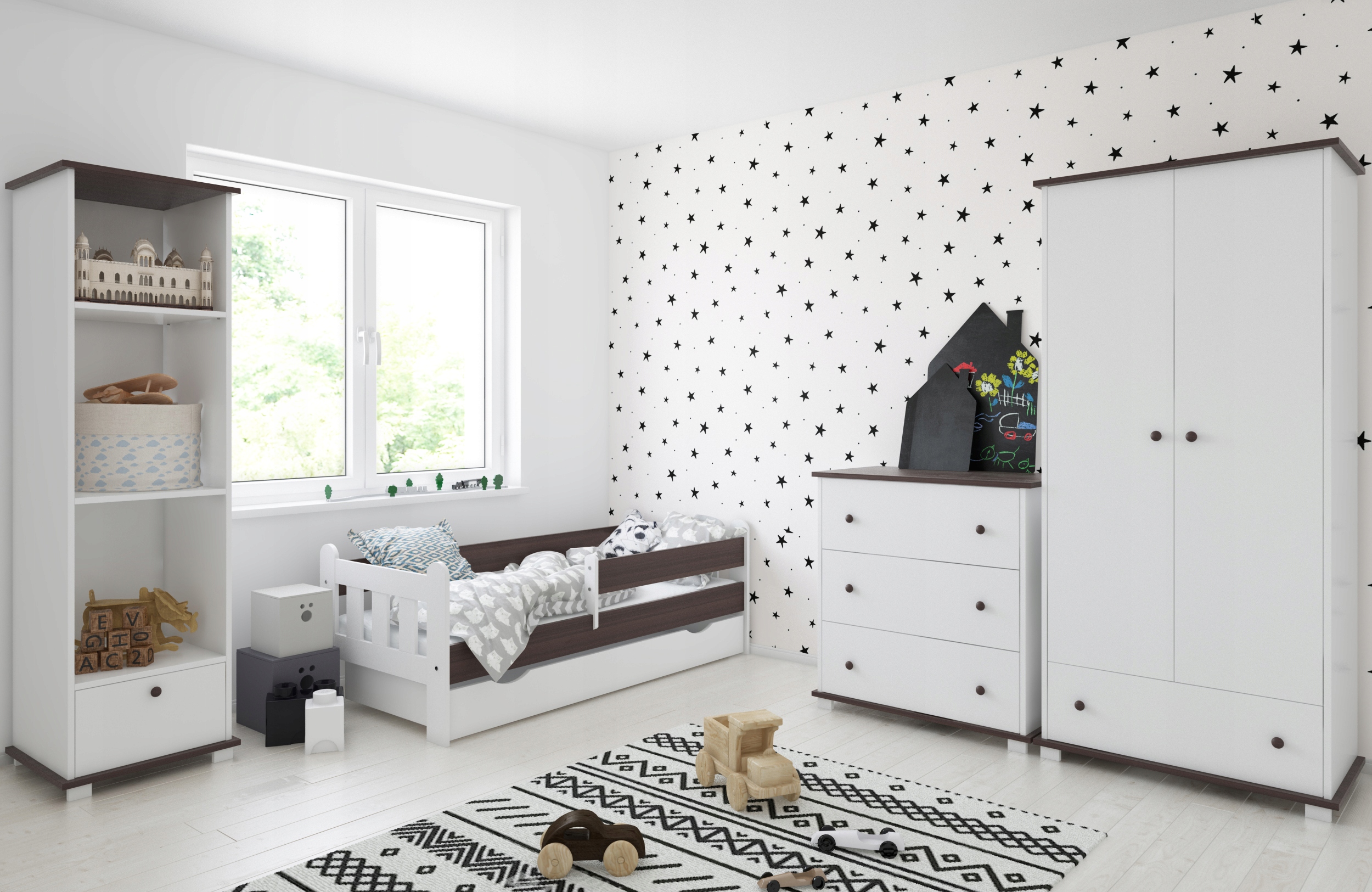 Деревянная детская кровать, сделанная из лакированного МДФ и ламинированного сопозиционного шарика - идеально подходит для маленького ребенка, который выращивает из детской кроватки. Рама соснового дерева гарантирует прочность и прочность. Кровать составляет до 100 кг, что позволяет родителям спать со своим ребенком. Он имеет две боковые и низкие уровни матраса для безопасности и удобства. Двойная производительность позволяет установить барьер справа или влево. Плотный, сертифицированный пенный матрас с крышкой для комфортного сна. Кроме того, кровать оснащена просторным ящиком на колесах, идеально подходящей для постельных принадлежностей или игрушек ребенка. Создайте уникальное место для сна и повеселиться для вашего малыша