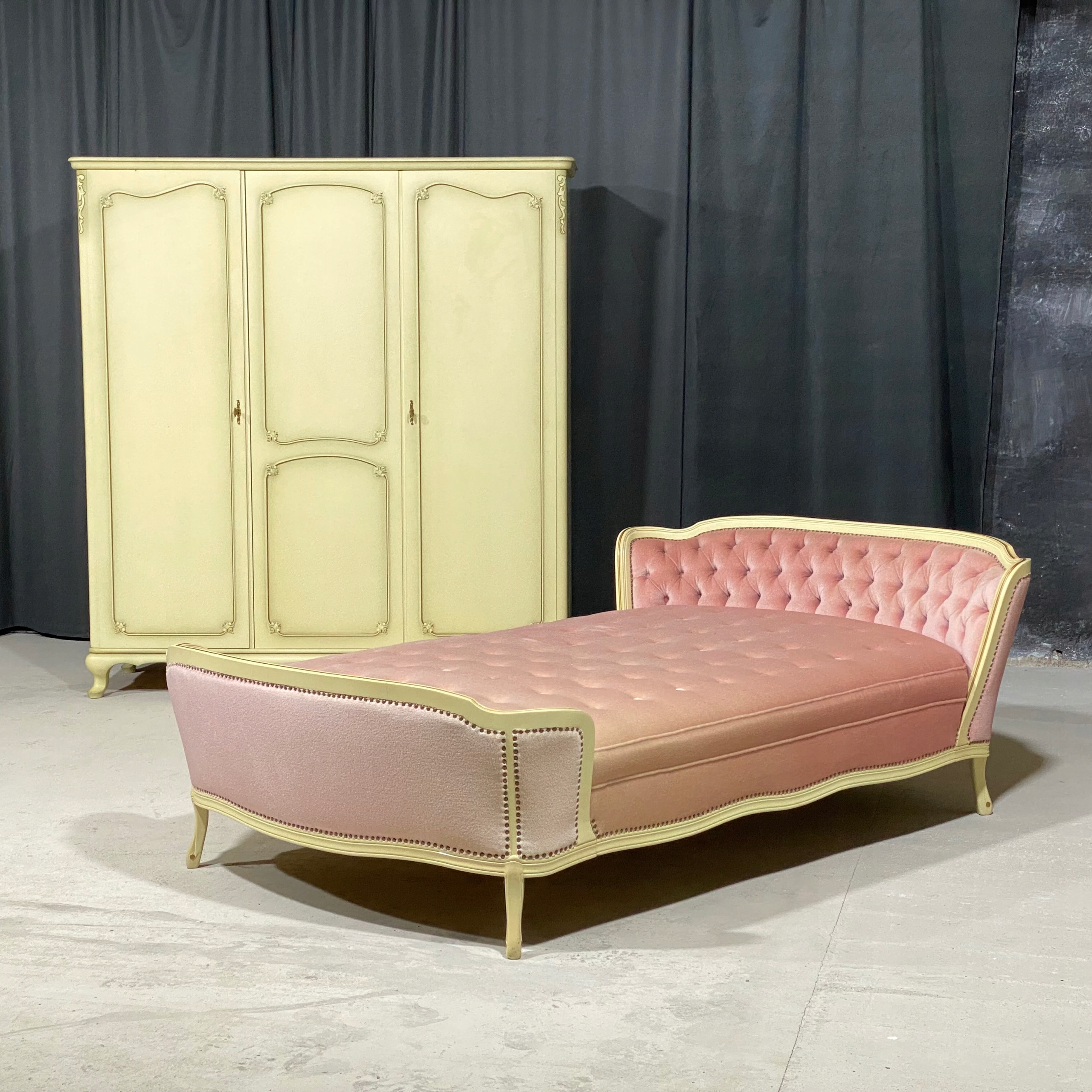 Кровать в стиле Людовика XV на деревянном корпусе цвета экрю / кремово-белого цвета, обитая нежно-розовой обивкой.