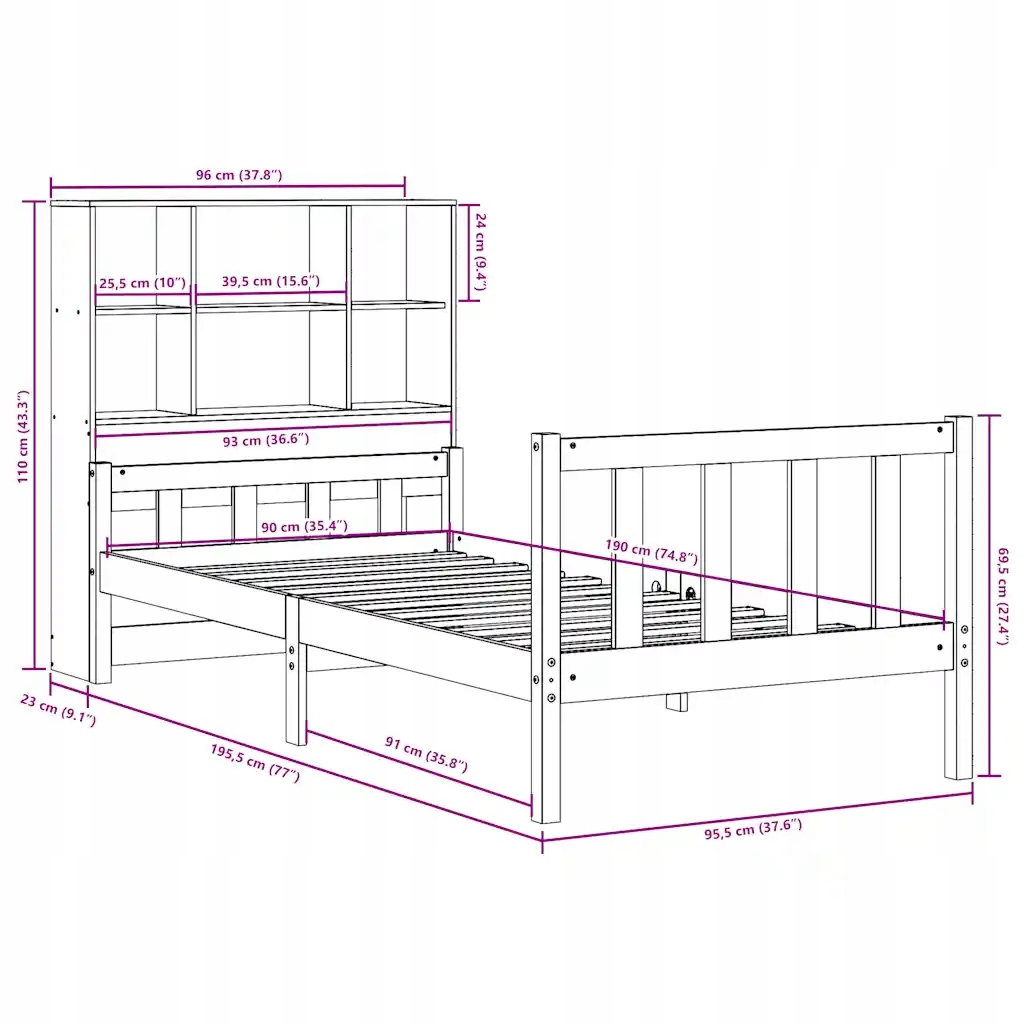 - Размеры: 96 x 23 x 110 см (ширина x глубина x высота) Ширина сопоставления матраса: 90 см