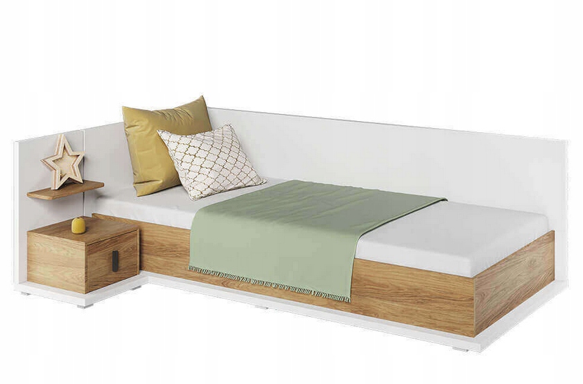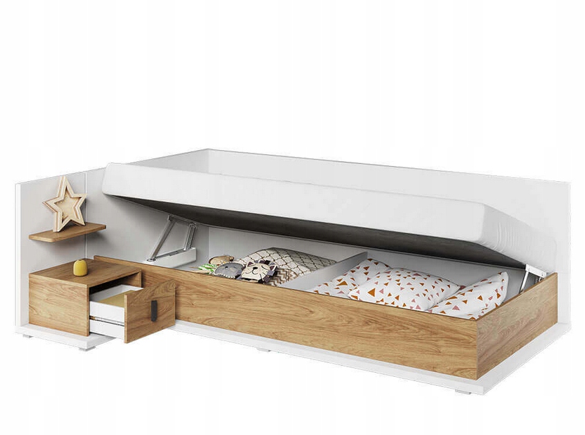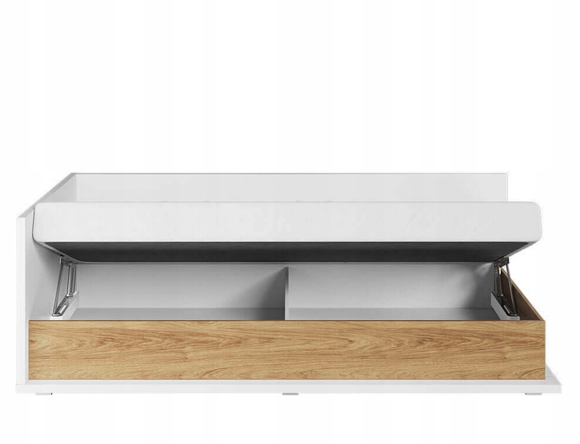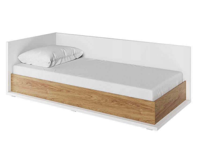 Удобная и практичная односпальная кровать SIMI в современном стиле. Вневременное сочетание белого цвета и декора из теплого дерева делает кровать уютной в любой комнате. Верхняя и боковые части мебели защищены дополнительной шторкой, благодаря которой кровать может выполнять функцию дивана. Просто дополните их подушками, чтобы получить комфортную поддержку. Внутри кровати вы найдете очень глубокий контейнер для постельного белья, одеял и других вещей. В комплект кровати входит удобный матрас Bonel. Мебель изготовлена из прочного ламината, отделанного прочной кромкой ABS.