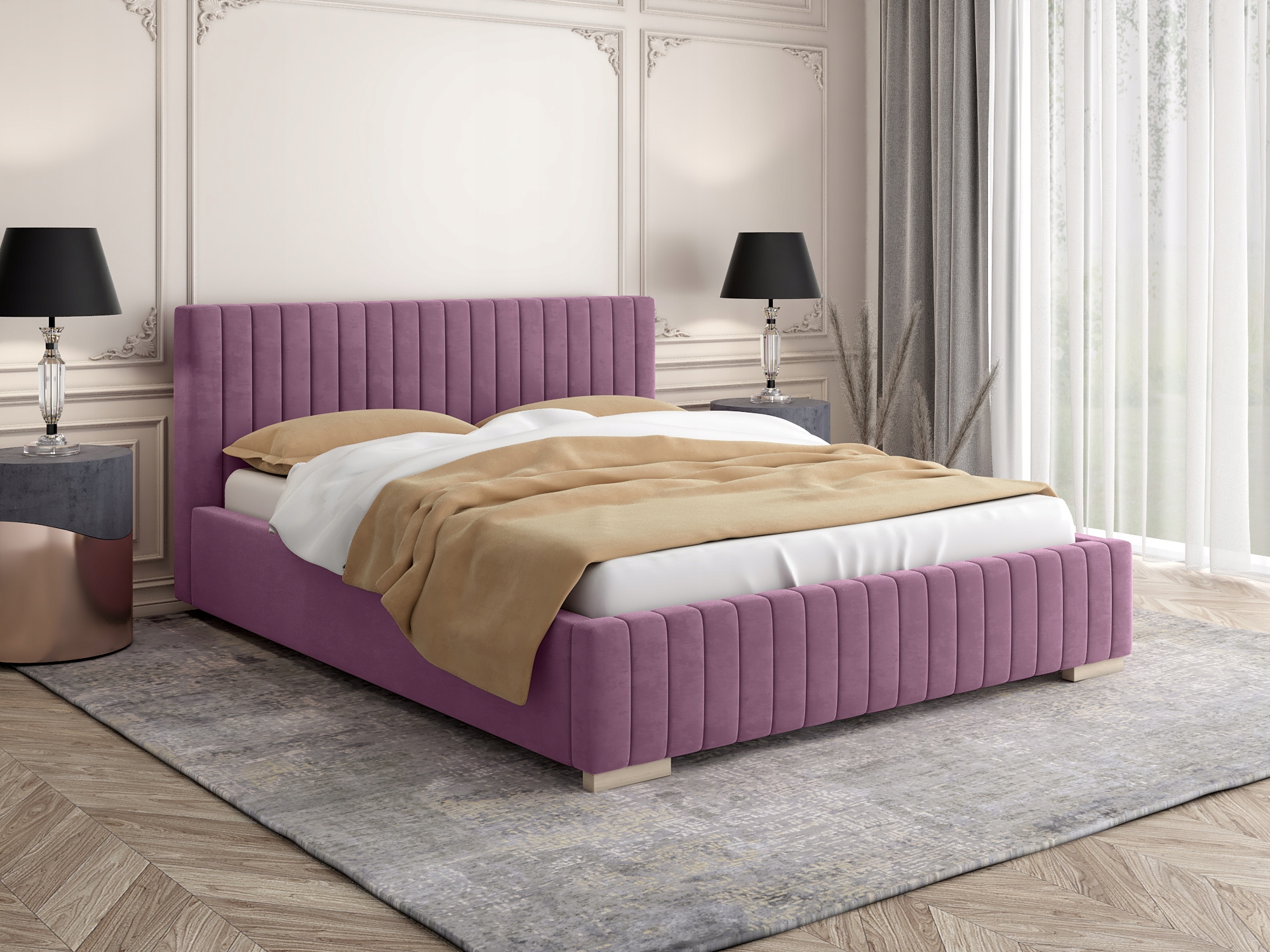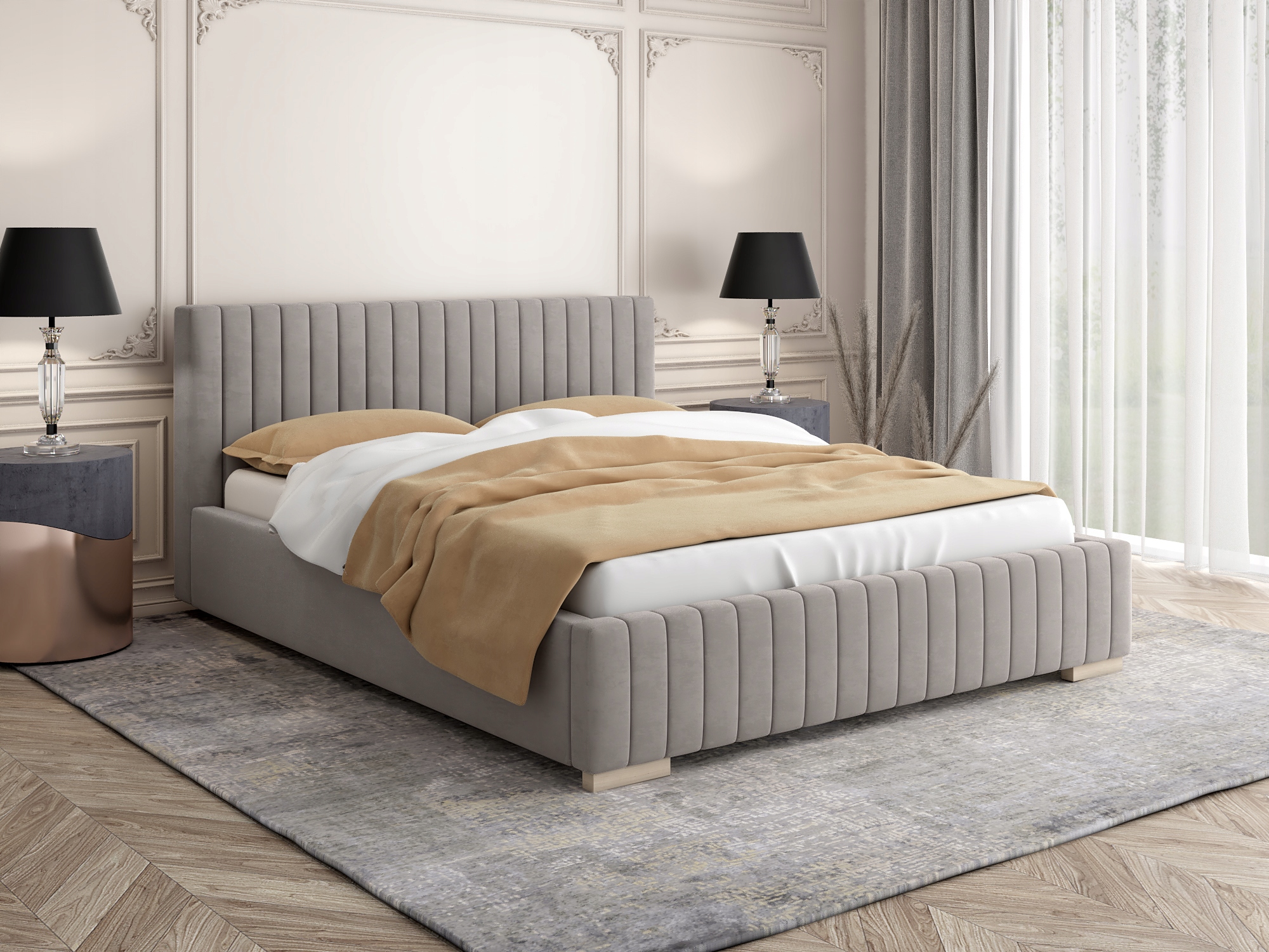 Корпус мебели, ее нижняя часть и изголовье покрыты обивкой, что придает кровать элегантный и стильный вид. Кровать имеет большой контейнер для постельного белья и автоматический механизм, который облегчает ее открывание и предотвращает падение.