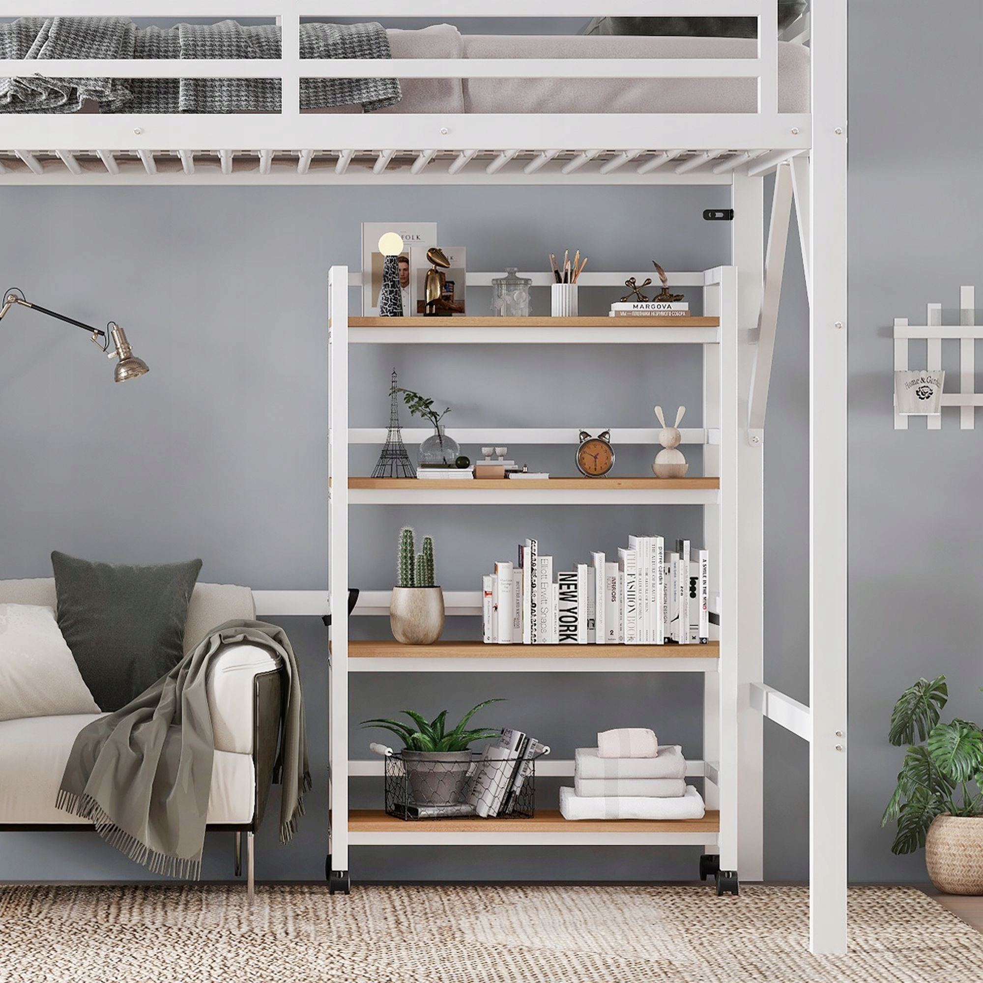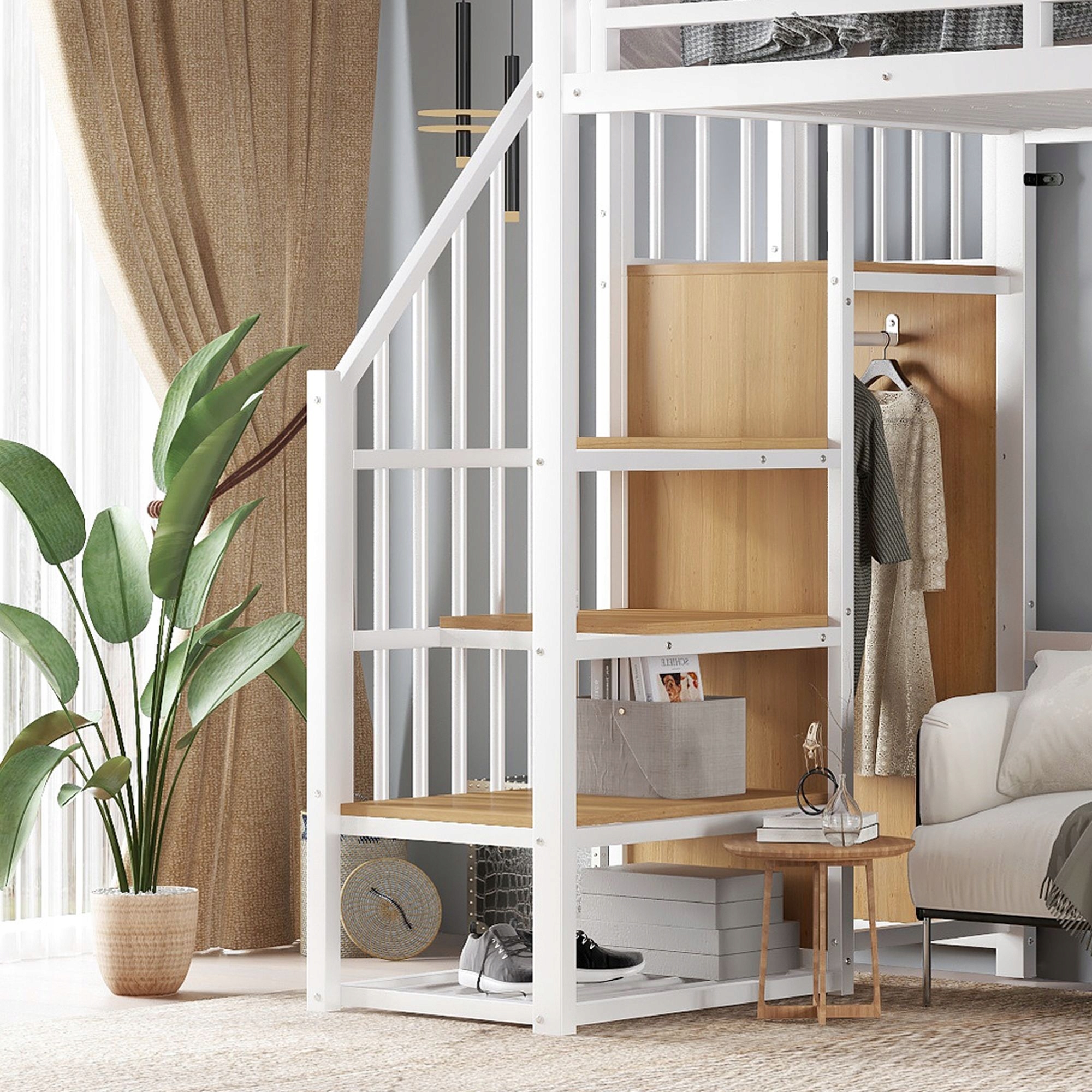 Кровать железная, двухъярусная, полка четырехъярусная на колесиках, перила безопасности, шкаф-лестница угловая с штангой для одежды, утюг+плита МДФ, белый+натуральный, 90х200 см