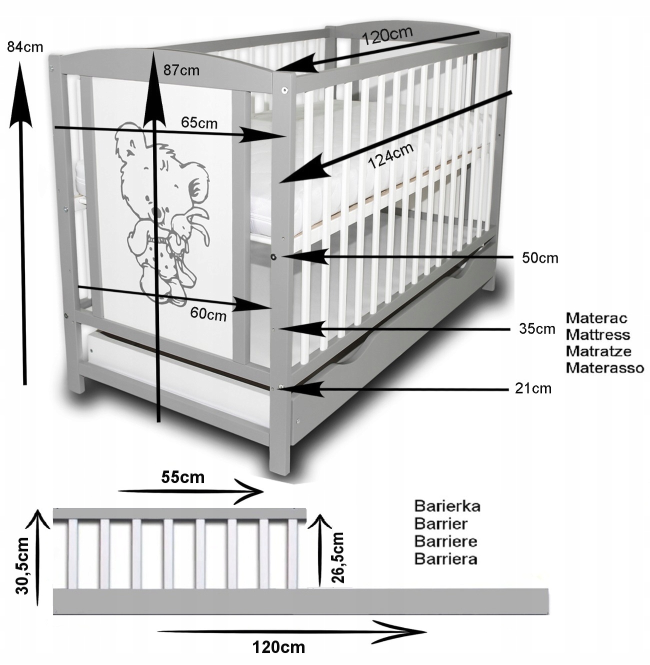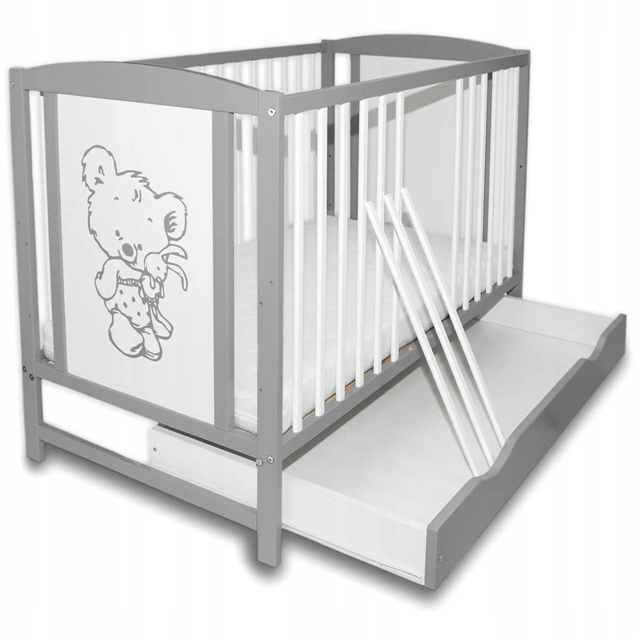 - Cot, сказка с ящиком 120x60 см в сером/белом