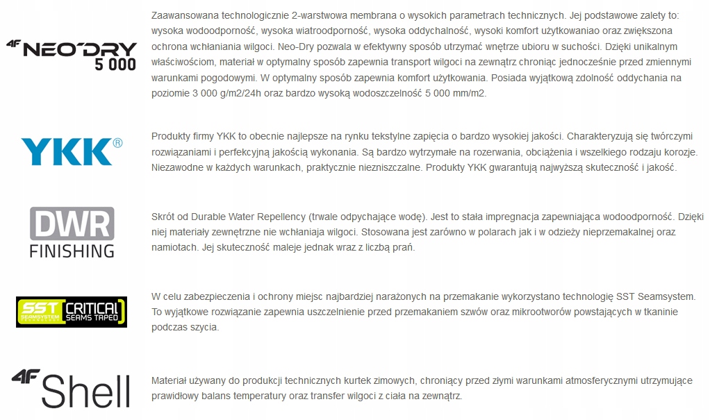 Высокотехнологичная зимняя куртка от 4F из новой коллекции, выполненная по технологии 4FShell. Он отличается высоким качеством изготовления и современным привлекательным дизайном, соответствующим последним тенденциям. Изготовлен из технического материала 4FShell с мембраной Neo'dry, обеспечивающей защиту во время зимних активностей. Проклеенные швы и гидрофобная пропитка по технологии DWR ограничивают впитывание воды снаружи. Внутренняя изоляция из полиэстера сохраняет тепло внутри. Идеально подходит для повседневного использования и интенсивного активного отдыха в качестве лыжной куртки. Куртка имеет различные типы карманов, в том числе: для очков, мобильного телефона или ски-пасса, пояса для снега и многих других инновационных решений. В куртке используется мембрана Neo'dry 5.000, высококачественная полиуретановая мембрана, защищающая пользователя от влаги из окружающей среды. Благодаря миллионам микроотверстий в материале Neo'dry обладает тройными свойствами: он блокирует ветер и воду из окружающей среды и выводит пот и влагу, возникающие в результате повышенной физической активности. Куртка дополнительно имеет высокий воротник-стойку, защиту подбородка перед молнией, молнии YKK, липучки в манжетах, а низ куртки можно регулировать с помощью кулиски и стопоров. Благодаря своей гибкости он идеально адаптируется к фигуре. Небольшой вес дополнительных слоев и эффективная система вентиляции гарантируют тепловой комфорт. Идеально подходит для всех видов спорта на открытом воздухе и повседневного использования.