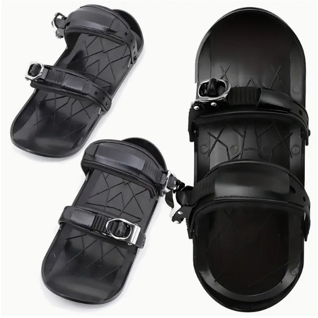 Система регулировки позволяет подогнать мини-лыжи к большинству зимних ботинок 👌. Эластичные ремни фиксируют стопу, обеспечивая безопасность и контроль во время спуска. Это практичное решение, избавляющее от необходимости приобретать специальную обувь.