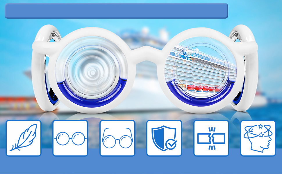 【Очки тошноты】: Эти очки для заболевания движения имеют структуру без линз с заполненным жидкостью круга. Уровень жидкости адаптируется к движениям транспортного средства и создает искусственный горизонт в области взгляда пользователя, который респинхронизирует глаза с помощью системы баланса. Эти простые, безопасные и натуральные стаканы для заболеваний движения свободны от лекарств и побочных эффектов, что обеспечивает надежное облегчение заболевания движения.