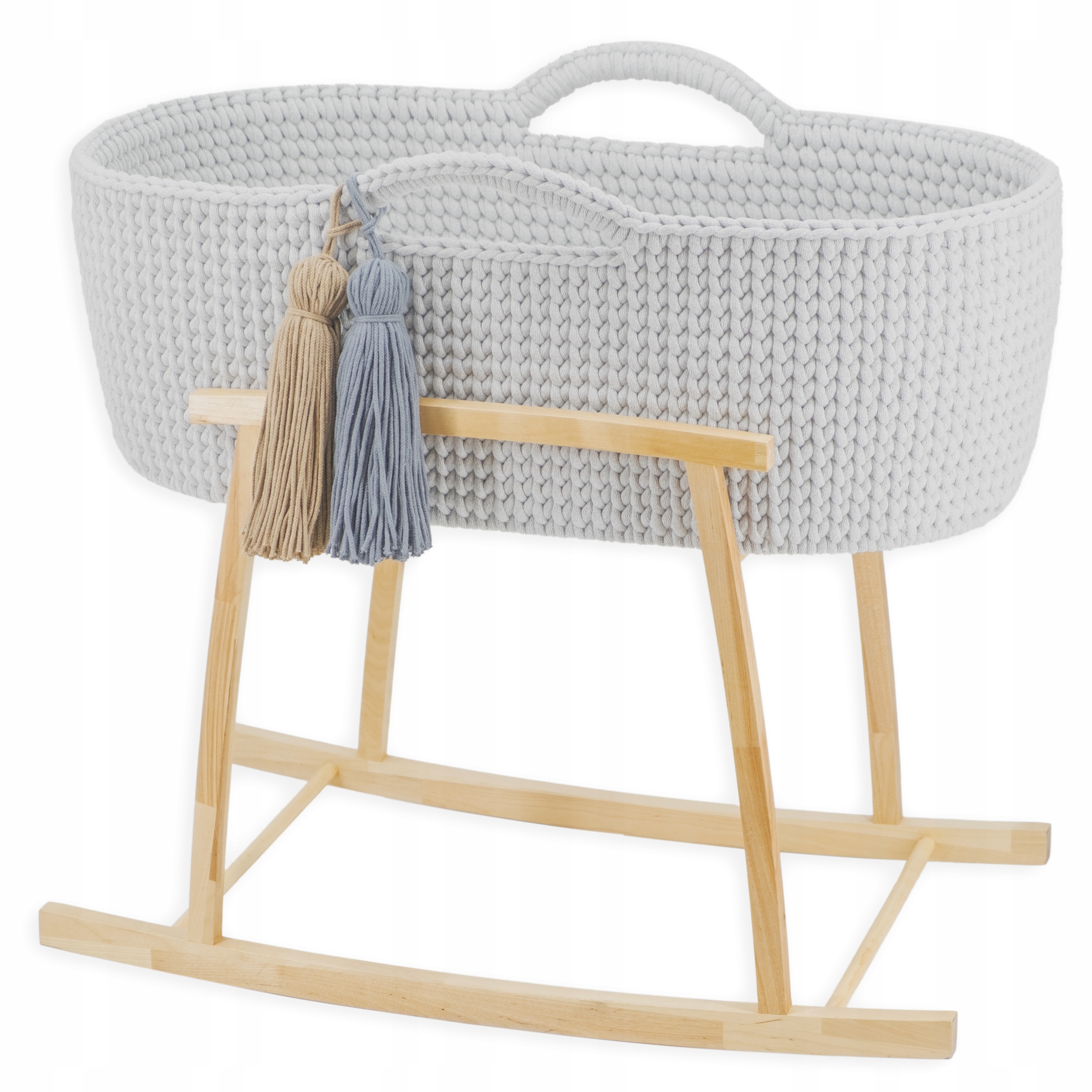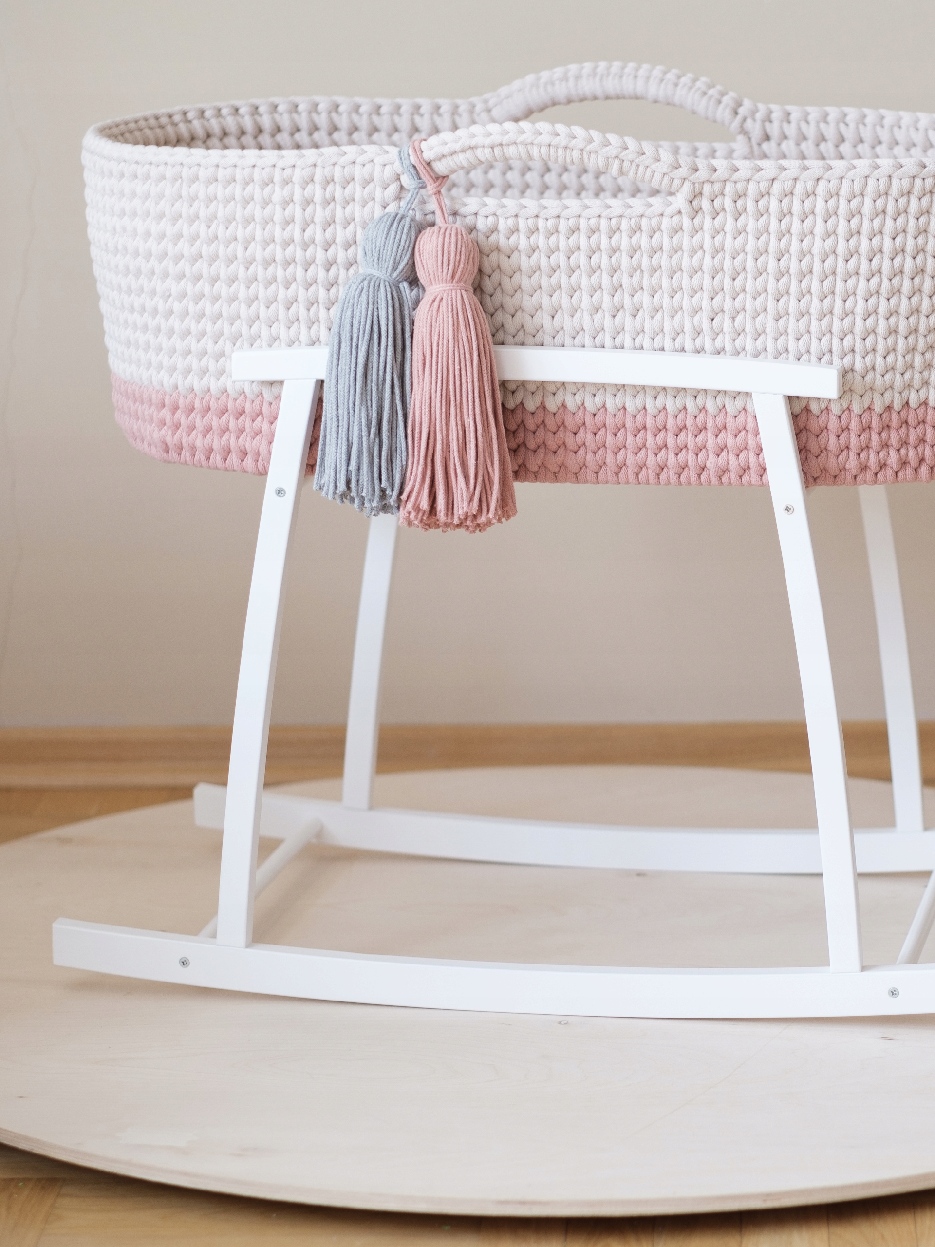 Наши корзины крепятся к каркасу с помощью 4 крючков, прикрученных ко дну корзины, поэтому, когда мы используем комплект в качестве люльки, ребенок в безопасности и при необходимости корзинку отстегивают от качалки одним движением, слегка потянув за уши корзинки вверх.