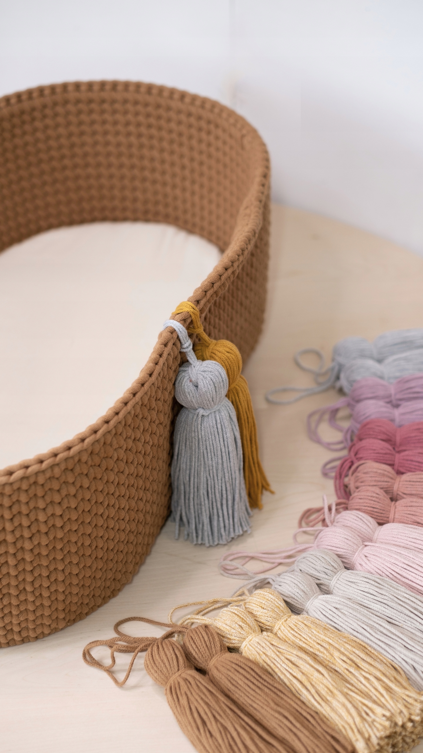 Корзина связана крючком из хлопковой нити толщиной 9 мм, материал сертифицирован безопасным для маленьких детей, в процессе изготовления не используются вредные вещества, сертификат OekoTex Standard 100. Дно корзины изготовлено из высококачественной деревянной фанеры. .