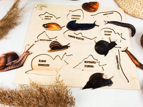 Ślimaki, drewniana układanka, gatunki ślimaków