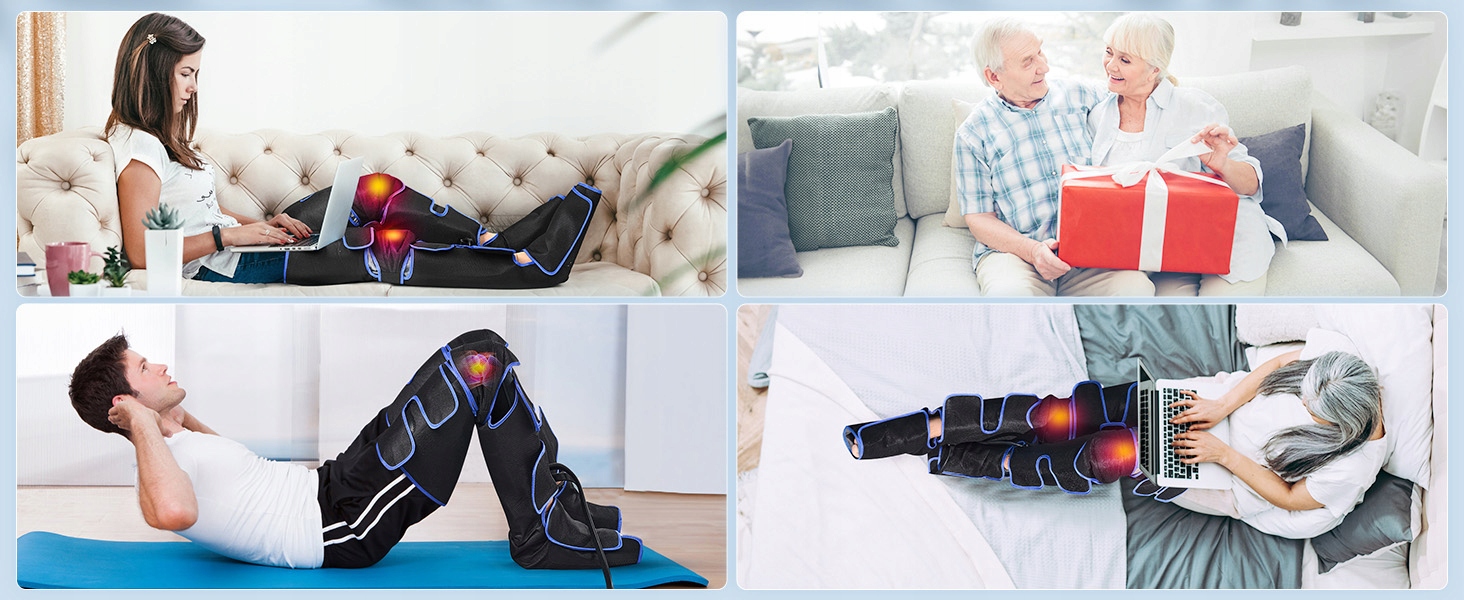 Этот массажер для ног предлагает 6 режимов: в том числе 3 различных зоны массажа - автоматический (бедра + икры + ступни), ноги (бедра или икры), ступни (только ступни); а также 3 приема – щипание (разминание), давление (надавливание), релаксация (расслабление). Вы также можете выбрать наиболее подходящую интенсивность (низкую, среднюю, высокую). Трехступенчатая функция обогрева обеспечивает тепло в области колена, облегчая боль в коленях, и ее можно отключить независимо.