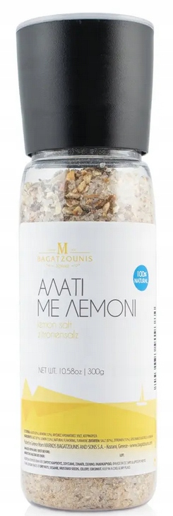 Соль бренда BAGATZOUNIS – это 100% натуральная морская соль с ароматом лимона. Идеально подходит к мясу на гриле или грибам, тушеным овощам и супам. Мы предлагаем использовать его для завершения блюд. Упаковано в профессиональную кофемолку размера XXL.