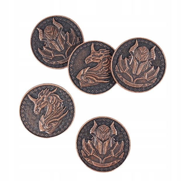 В этой категории вы найдете металлические монеты, связанные с определенными темами или названиями игр. В наборах присутствуют изделия, имитирующие золото (покрытое слоем латуни), серебро (со слоем никеля) или медь (со слоем меди). Их дизайн отсылает к постапокалипсису, фэнтези, стимпанк-играм в атмосфере Средневековья, античности, космоса и романам Лавкрафта.