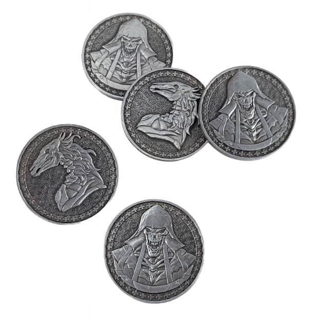 В этой категории вы найдете металлические монеты, связанные с определенными темами или названиями игр. В наборах присутствуют изделия, имитирующие золото (покрытое слоем латуни), серебро (со слоем никеля) или медь (со слоем меди). Их дизайн отсылает к постапокалипсису, фэнтези, стимпанк-играм в атмосфере средневековья, античности, космоса и романам Лавкрафта.