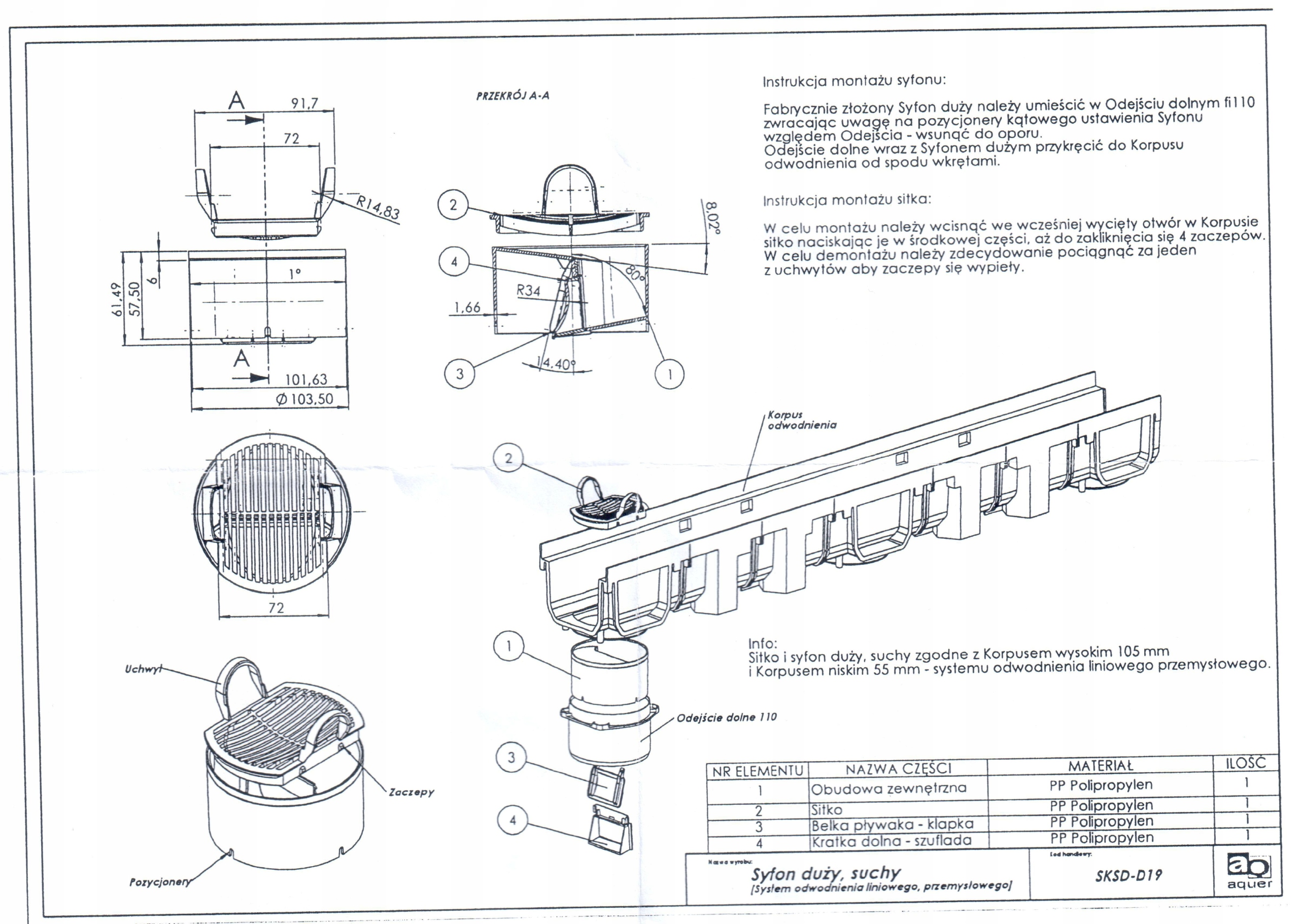Сифон оснащен поплавковой балкой – заслонкой, работающей по принципу защелка. Под давлением воды, протекающей по желобу, заслонка приподнимается, позволяя воде вытечь через сифон и далее в канализацию. После слива воды заслонка опускается и плотно закрывает сифон.