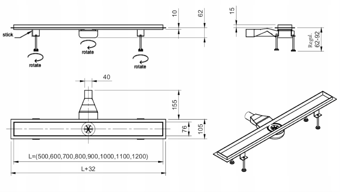 - Регулируемые ножки, позволяющие точно установить слив, высота от 6,2 см до 9,2 см – в зависимости от модели. в зависимости от потребностей установки.