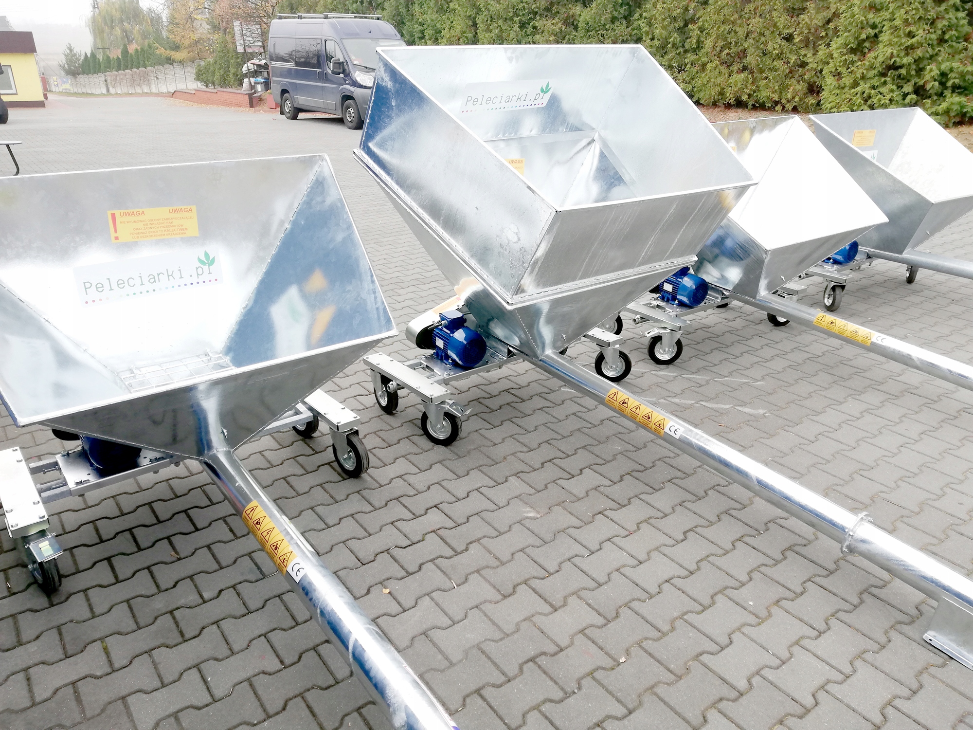 Устройство полностью оцинковано, что делает его устойчивым к истиранию, ржавчине и царапинам. Прочная конструкция устройства на тележке и 4 колесах позволяет кормушке свободно перемещаться даже по неровным поверхностям. Загрузочный бункер максимально увеличен (самый большой на рынке), поэтому одноразовая загрузка позволяет очень долго работать без обслуживания. Форма винта имеет эргономичную форму, благодаря чему винт не засоряется и обеспечивает безотказную работу.