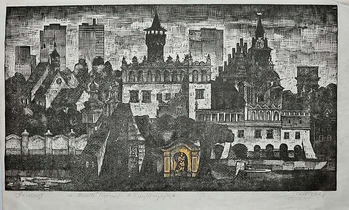 - Подпись: Гравюра, подписанная карандашом под композицией: «Линогравюра #Город Тарнув - Композиция # Из Ацеданьского»