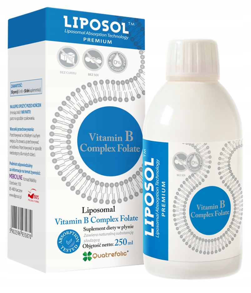 Liposol B Complex Folate был заблокирован в липосомах. Липосомы представляют собой небольшие липидные частицы (шарики), которые образуются естественным образом во время контакта воды с лецитином, компонентом генетически не модифицированной сои. Липосомы легко поглощаются организмом. Когда витамины растворяются в воде и смешиваются с лецитином, происходит липосомальная инкапсуляция. Результатом является лучшее поглощение витаминов в крови и непосредственно в клеточных стенках.
