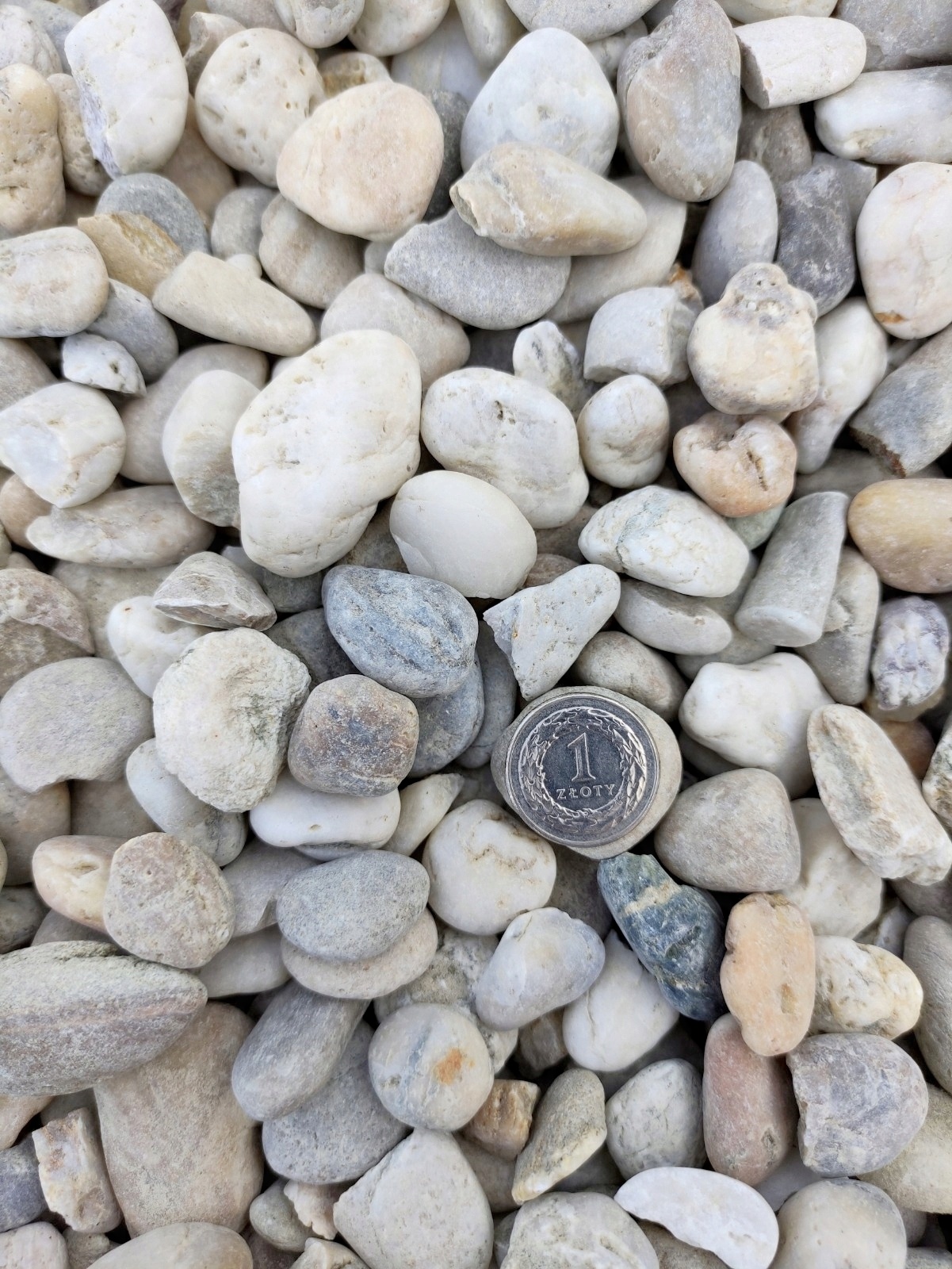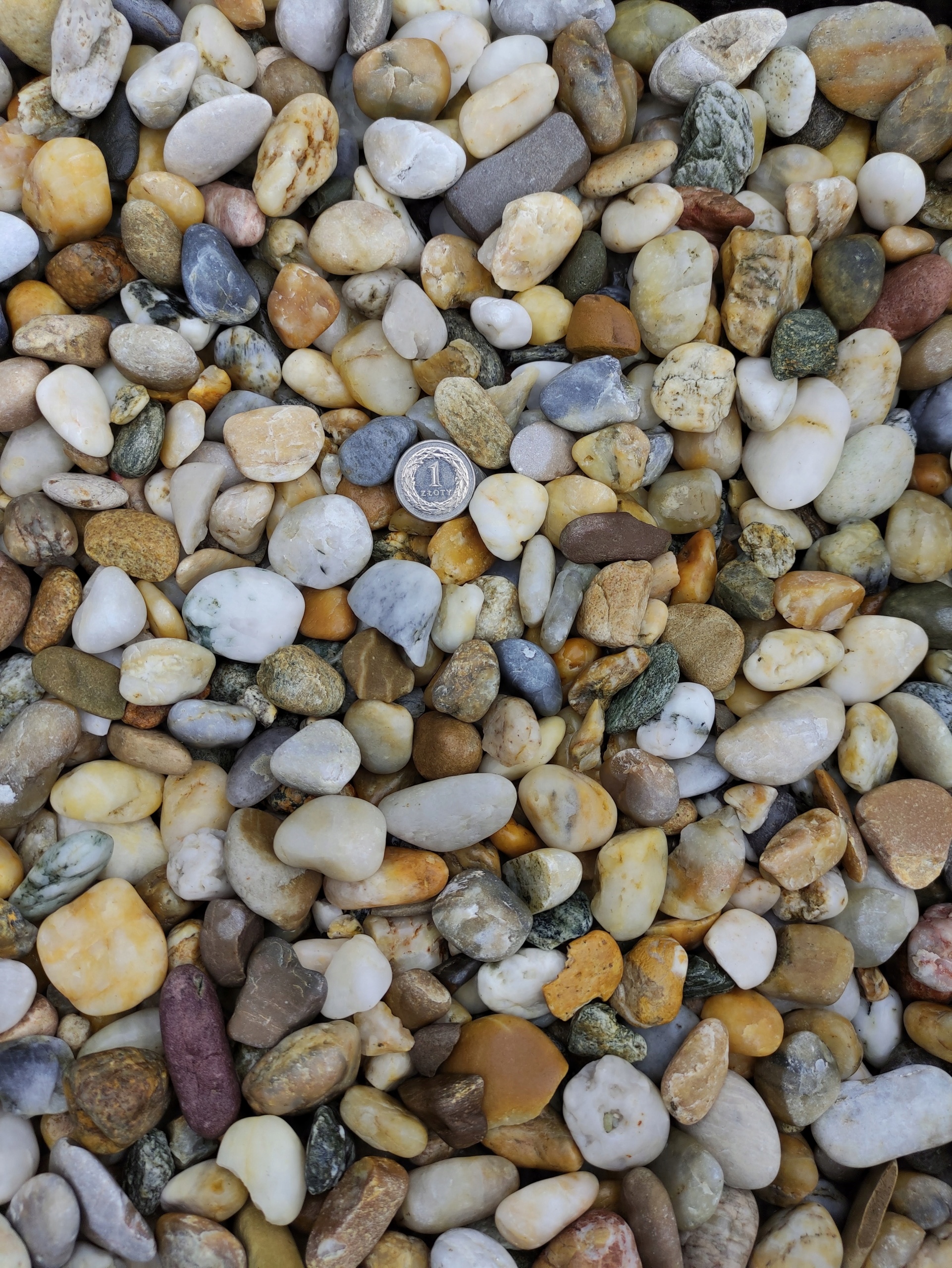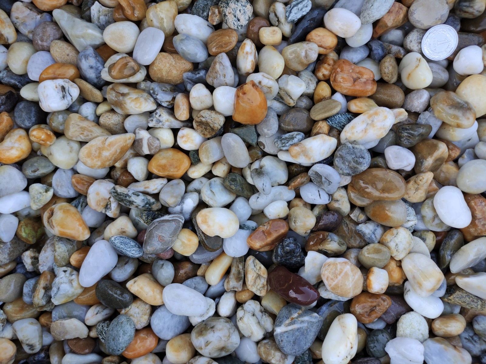 Импортная натуральная, неокрашенная медовая галька с преобладающей фракцией 16-22 мм, упаковка 0,5 кг, т.е. около десятка штук.