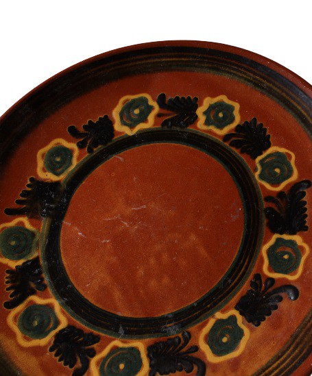 Глиняная тарелка, украшенная цветочным мотивом в деревенском стиле. Он из кооператива «Каменка» в Лысой Гуре. 1970-е годы.