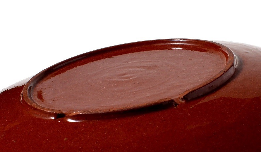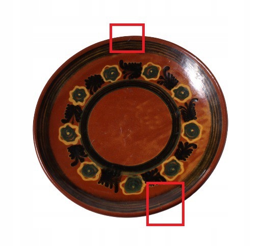 На глазури имеются функциональные царапины и несколько потертостей. Отверстия для струны сломаны - на фотографиях видны места потери керамической массы. Коричневый цвет поверхности местами бледнее. На стекле, идущем от верхнего края к центру, поверхностная трещина в глиняной массе около 3 см, созданная перед глазурованием, и короткая нитевидная бороздка около 1 см - так выглядит создан механически (также до глазурования).
