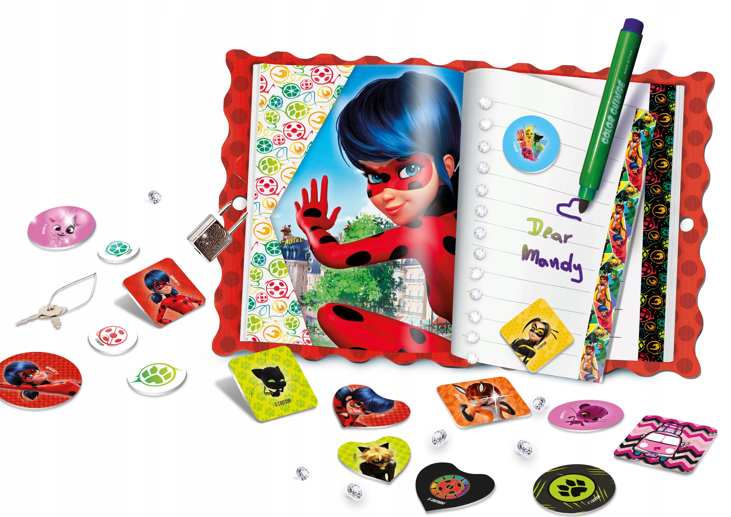 Создайте свой секретный дневник! Благодаря лицензионному набору «Божья коровка и Супер-кот» ваш ребенок сможет создать дневник, доступ к которому будет только у него. Внутри есть все необходимое для его украшения – блестки, наклейки, цветные фломастеры и многое другое! Чтобы обеспечить некоторую конфиденциальность, дневник снабжен настоящим замком и ключами. В комплекте: дневник для творчества, замок с ключами, ароматизированные наклейки, фломастеры, флуоресцентные маркеры, меняющие цвет маркеры, наклейки с драгоценностями, инструкция, возраст 5+