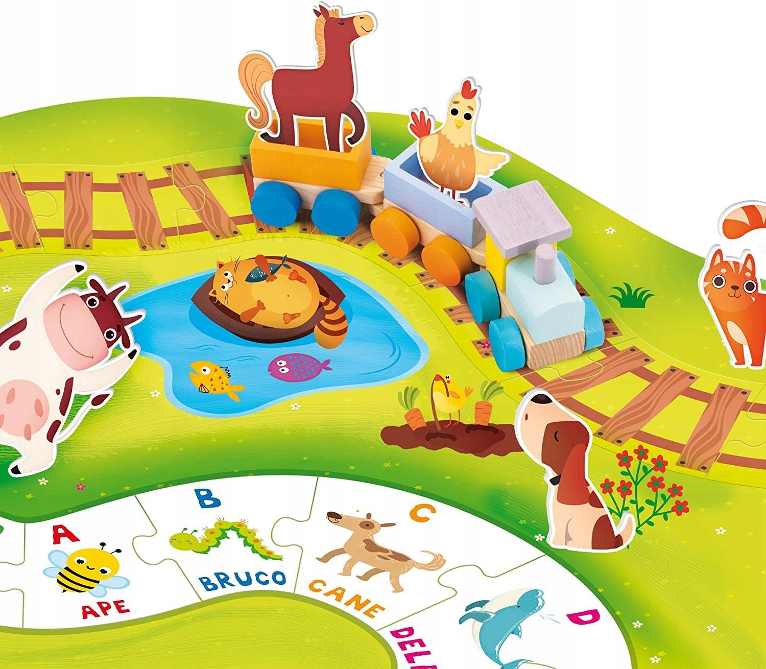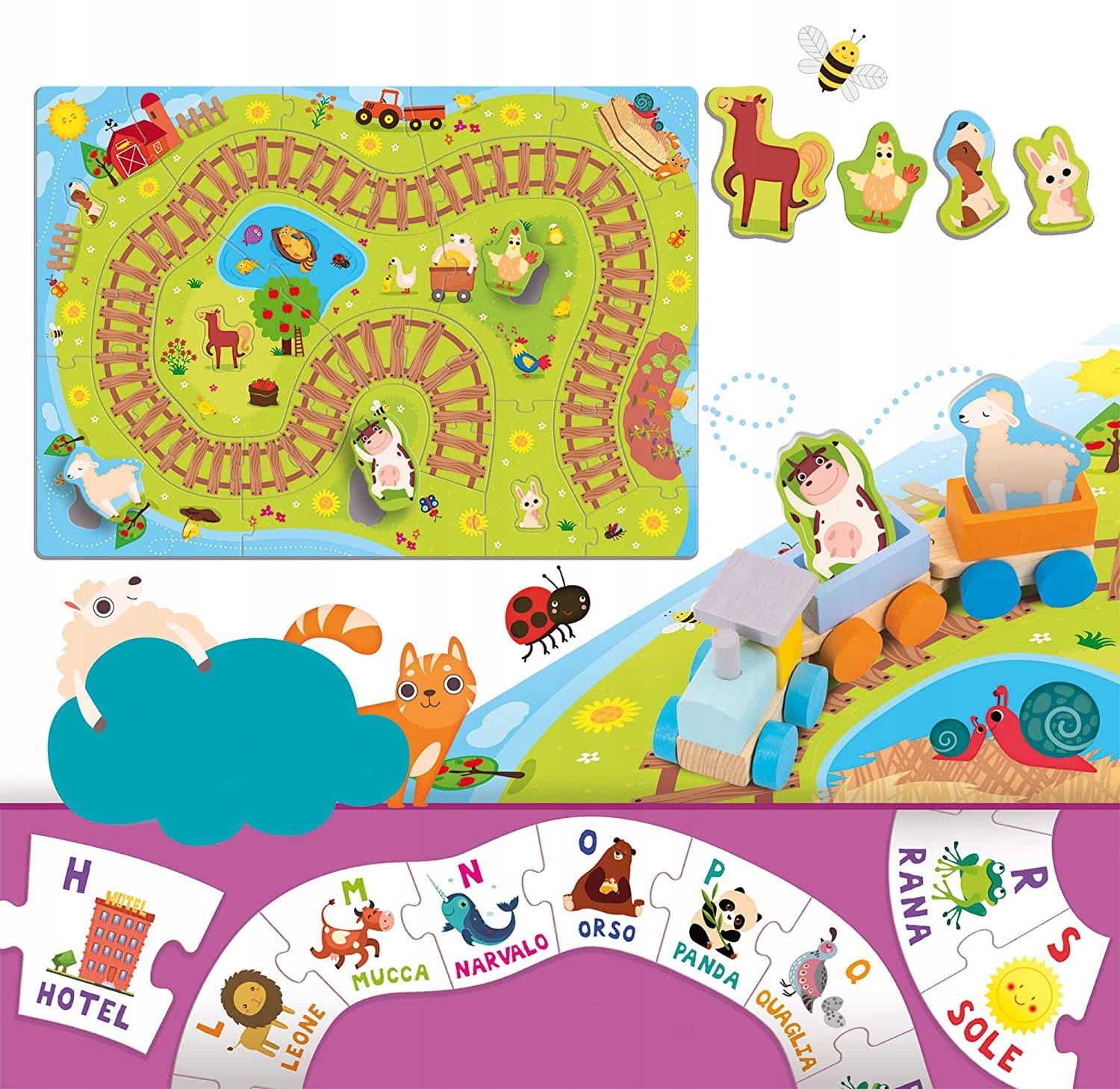 Деревянный поезд для знакомства с фермой, предназначен для детей от 2 лет. Создайте маршрут, используя двусторонние картонные куски с гвоздиками. Каждый элемент имеет букву алфавита и слово, начинающееся на нее. Останавливая поезд в определенных местах маршрута, ребенок может произносить алфавит и учить новые слова. В набор входят профилированные животные.