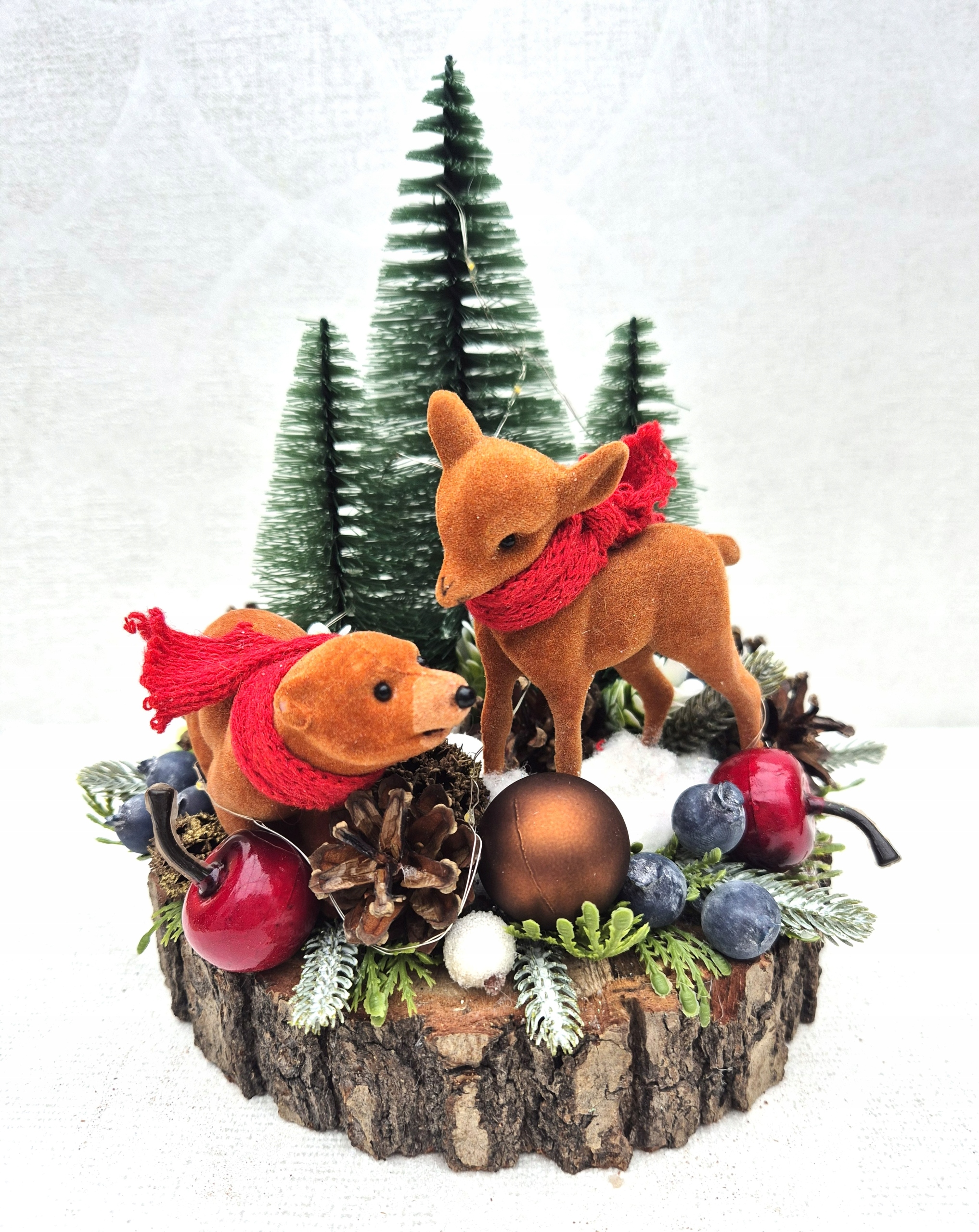 Венок можно сочетать с соответствующим украшением ручной работы в виде оленя и медведя, закрепленных на куске натурального дерева. Вместе они создают уникальный, целостный декоративный набор в атмосфере зимнего леса.