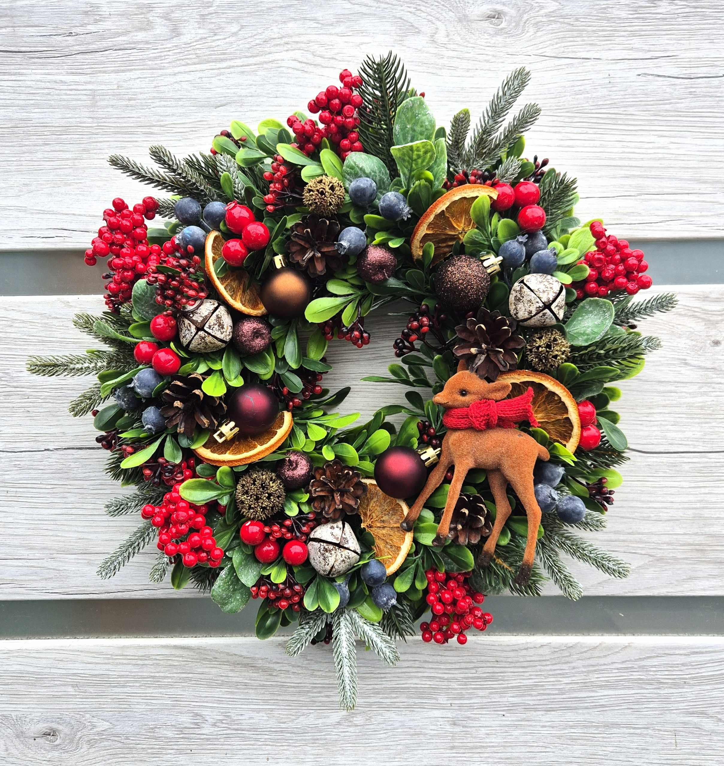 Венок восхищает своим простором и глубиной. Сочетание насыщенной зелени, сочных красных ягод, сушеных ломтиков апельсина и декоративных безделушек создает элегантную и теплую композицию, вдохновленную природой. Особый шарм придает очаровательный бархатный олень в красном платке – тонкий, но очень выразительный акцент, который притягивает взгляд и придает всему произведению сказочную атмосферу.