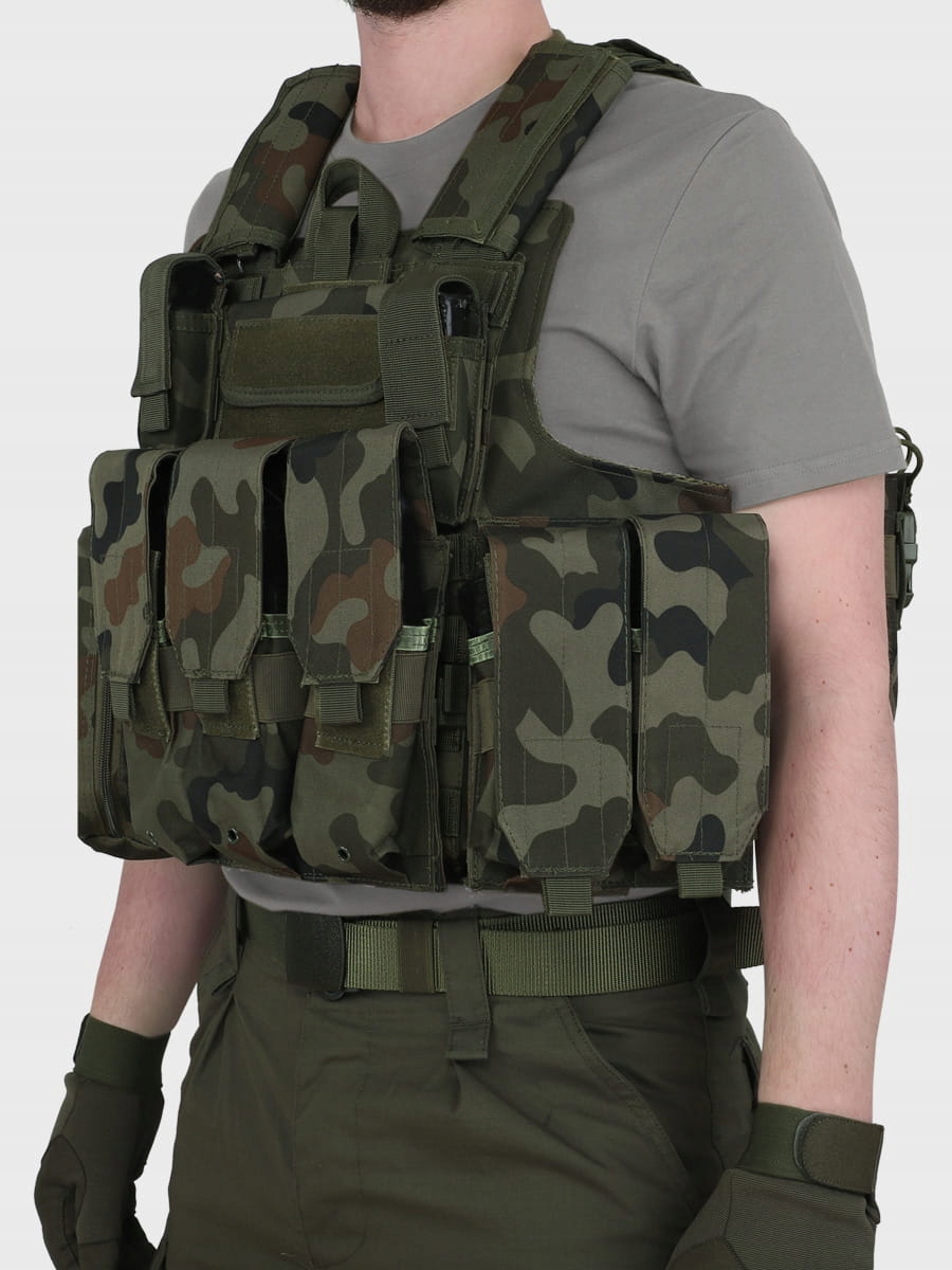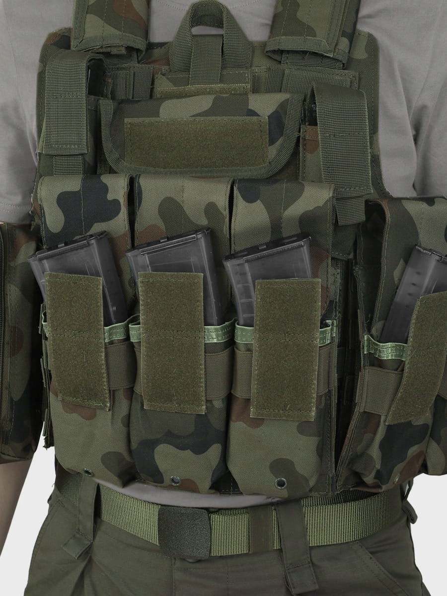 Жилет с патронами польского бренда DOMINATOR® в камуфляже WZ 93 Жилет изготовлен из прочного нейлона. В основе конструкции две панели - передняя и задняя, в которых могут быть размещены баллистические вставки. По бокам жилет застегивается на боковые панели на липучке и широкой резинке, благодаря чему жилет подстраивается под окружность. Внутренний слой 3D-сетки улучшает циркуляцию воздуха. На плечах имеются накладки на липучке, повышающие комфорт использования, особенно при больших нагрузках.
