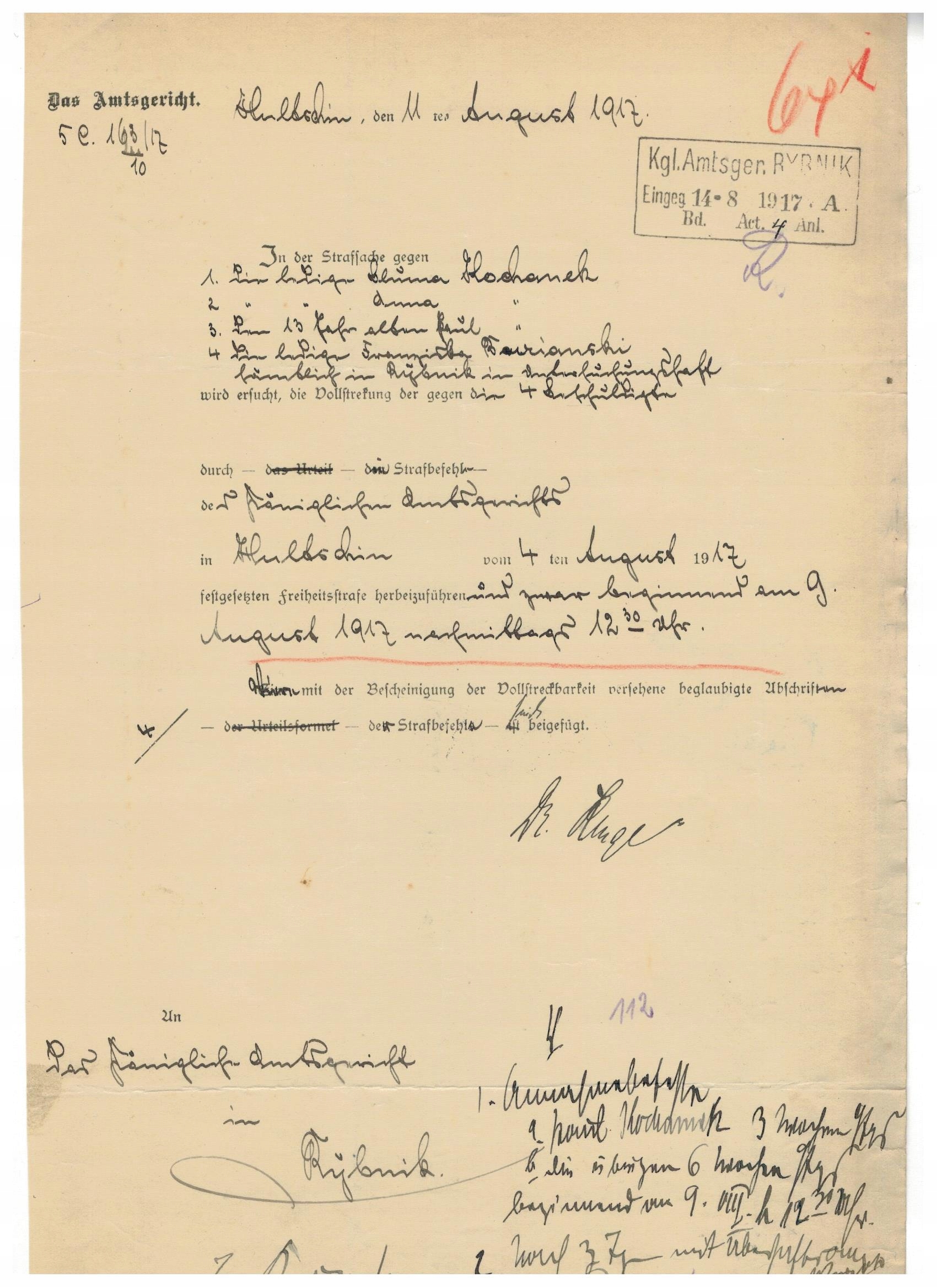List Pismo procesowe sądowe Rybnik 1917 Czechy