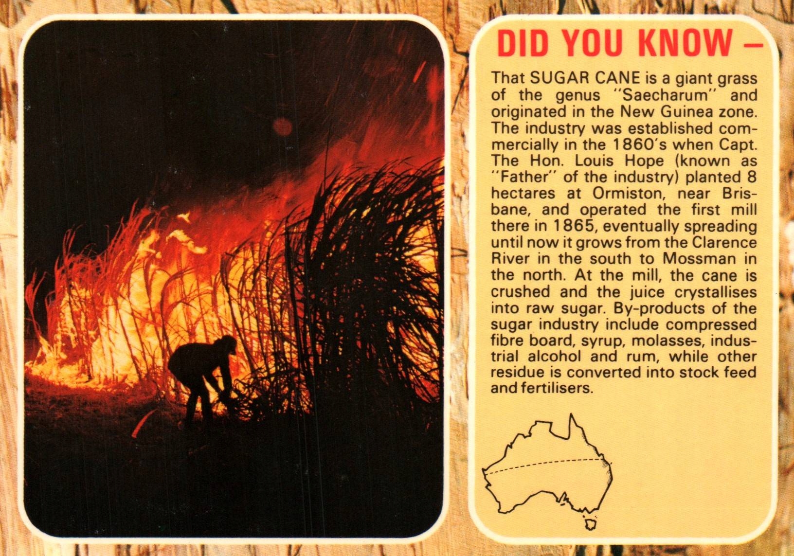 На этой открытке сцена курящего сахарного тростника, практика, используемая перед сбором урожая, и она содержит интересную образовательную информацию о сахарной промышленности в Австралии. Аверс «Открытки» разделен на две части: слева на фигуре есть динамичная фотография сотрудника на фоне горящего сахарного тростника, образуя драматическую и эффективную картину в оттенках красного и апельсина. Справа, на бежевом фоне, раздел «Знаете ли вы -» (знаете ли вы ...), содержащий подробное описание сахарного тростника (Saccharum) и истории сахарной промышленности в Австралии, от его происхождения в Новой Гвинее, через пионеров, таких как Capt. Достопочтенный Луи надеются, к -продуктам, таким как ром и патока. В нижней части этого раздела существует схематическая карта Австралии с выбором областей выращивания сахарного тростника.