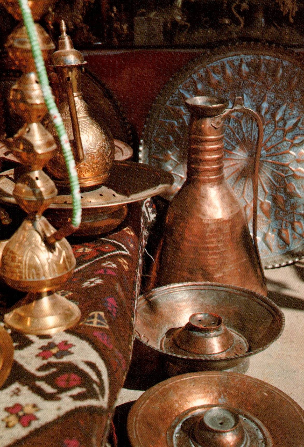 На этой открытке изображен традиционный рынок медников в Багдаде, где представлены изделия ручной работы из меди и латуни - предметы повседневного обихода и декоративного искусства, которые являются частью богатого ремесленного наследия Ирака.