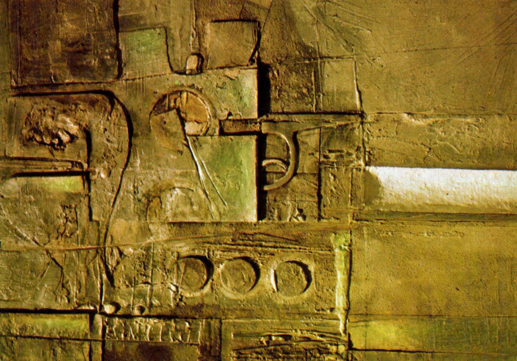 На лицевой стороне открытки изображена абстрактная, фактурная композиция в оттенках зеленого и коричневого, с четкими рельефными геометрическими элементами и неправильными формами. Картина имеет необработанную, слегка состаренную фактуру, придающую ей глубину и художественный характер.