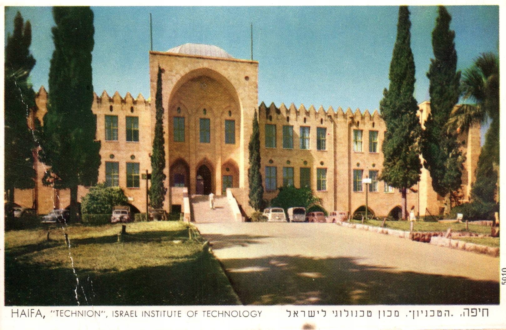 Красочная открытка представляет собой историческое здание технологии - Израильский институт технологии в Хайфи. В начале 20-го века было установлено здание в стиле восточного классического, с характерным арочным входом, башней и кипарисами по бокам. На площади перед университетом есть автомобили из эпохи, и все это окружен зеленью, подчеркивая престиж и мир этого научного центра.