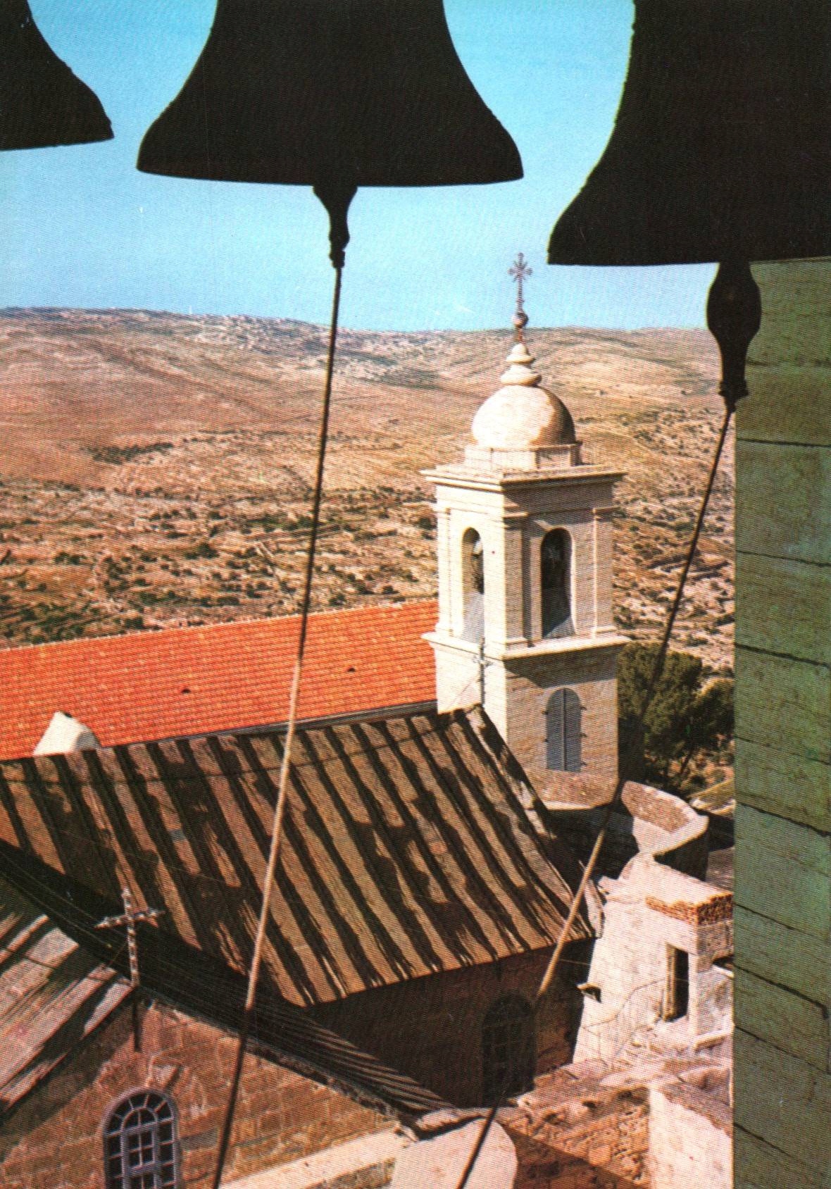 На этой открытке изображен живописный вид с колокольни одной из церквей Вифлеема с колоколами на переднем плане и панорамой холмов Иудеи на заднем плане.