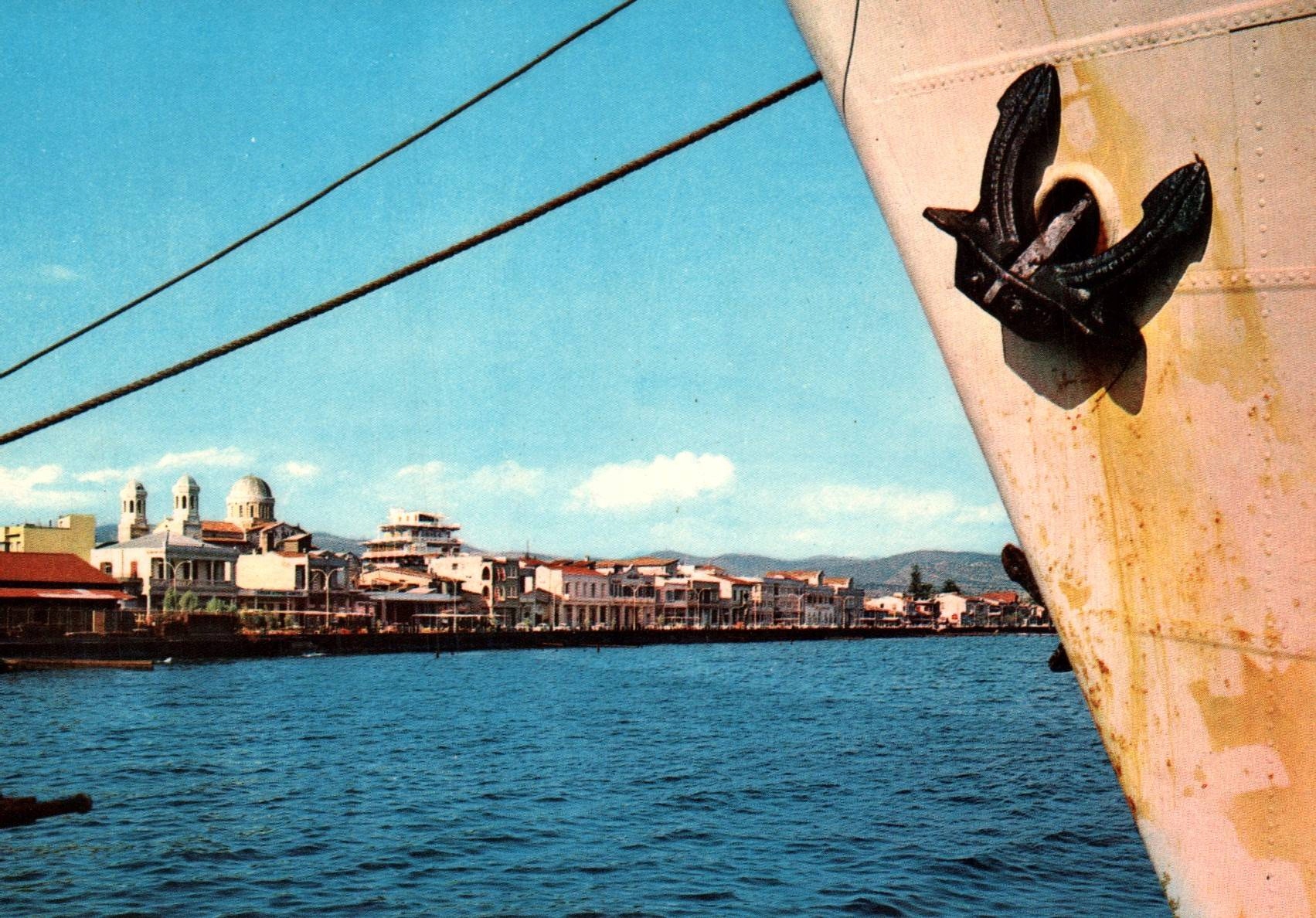 На переднем плане фрагмент борта корабля с цепью и прикрепленным якорем, что придает снимку морской характер. На заднем плане - панорама набережной Лимассола с городской застройкой - среди прочего можно увидеть характерные церковные купола и многоквартирные дома и постройки на набережной. Вдалеке вырисовываются горы Троодос.