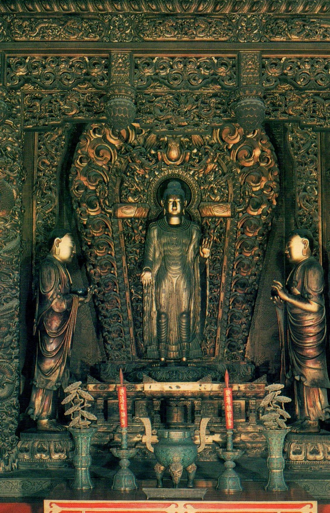На этой открытке изображена впечатляющая ниша Будды, замысловато вырезанная из драгоценного дерева Наньму, с тонким золотым декором.