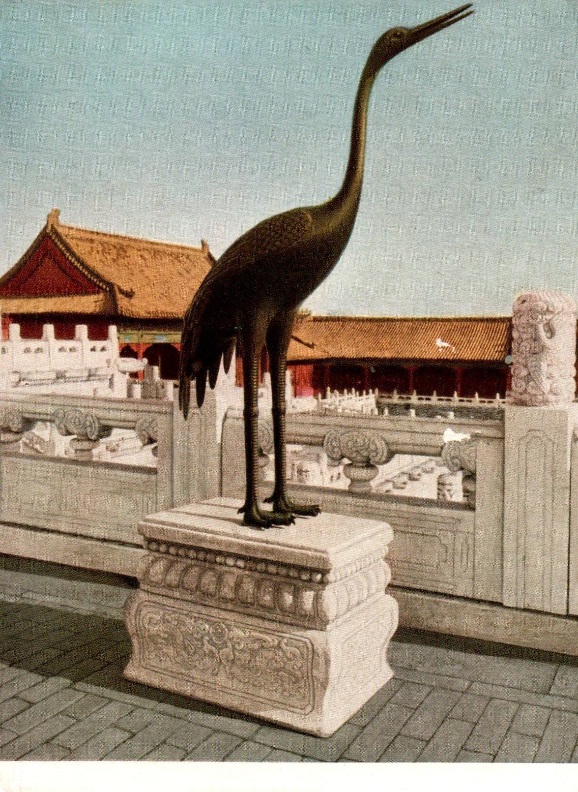 На этой открытке изображена церемониальная бронзовая статуя журавля, типичная для Запретного города в Пекине, на фоне традиционной китайской архитектуры.