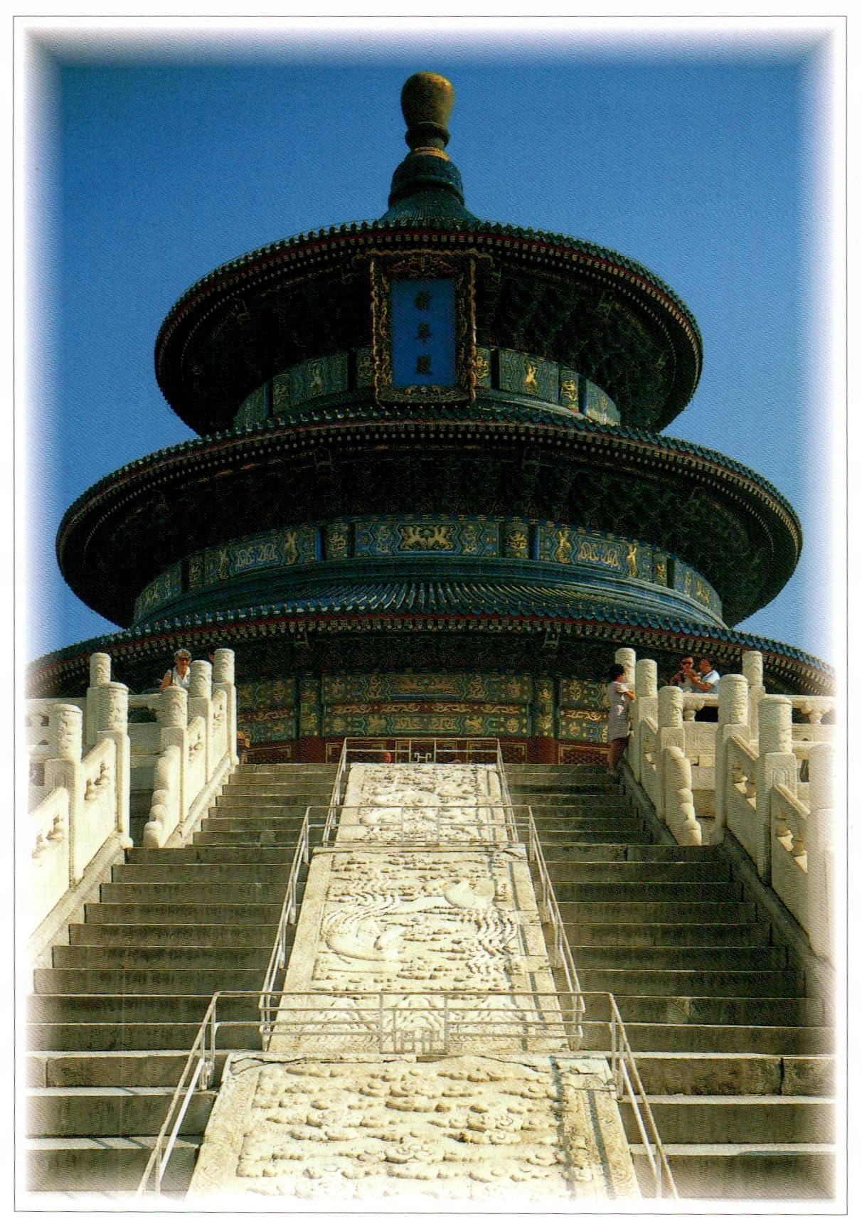 На этой открытке изображен величественный вид на Зал Молитвы о Добром Урожае, главное здание комплекса Храма Неба в Пекине.