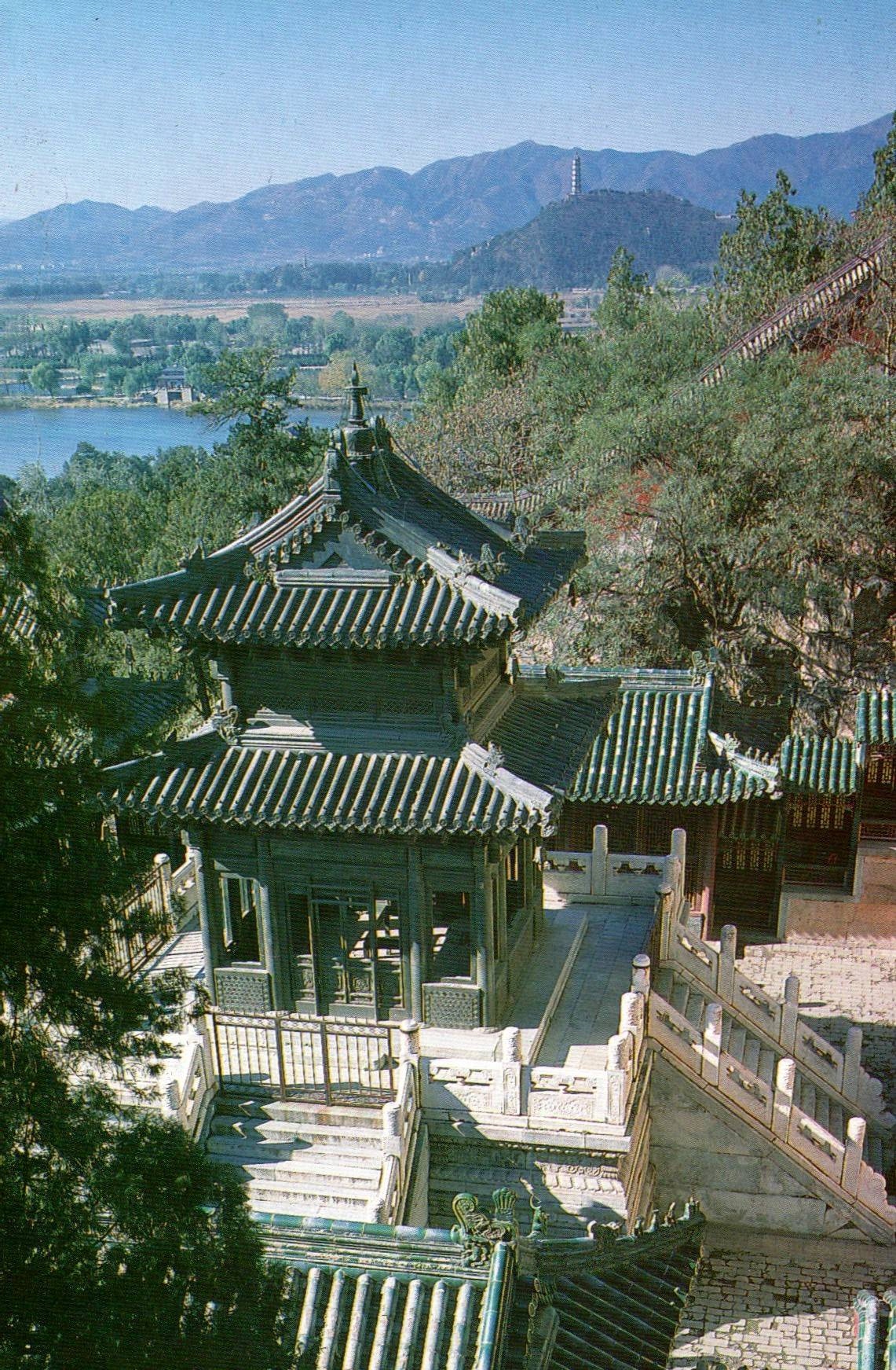 На этой открытке изображен живописный вид на Бронзовый павильон Летнего дворца в Пекине с обширным пейзажем озера и гор на заднем плане.