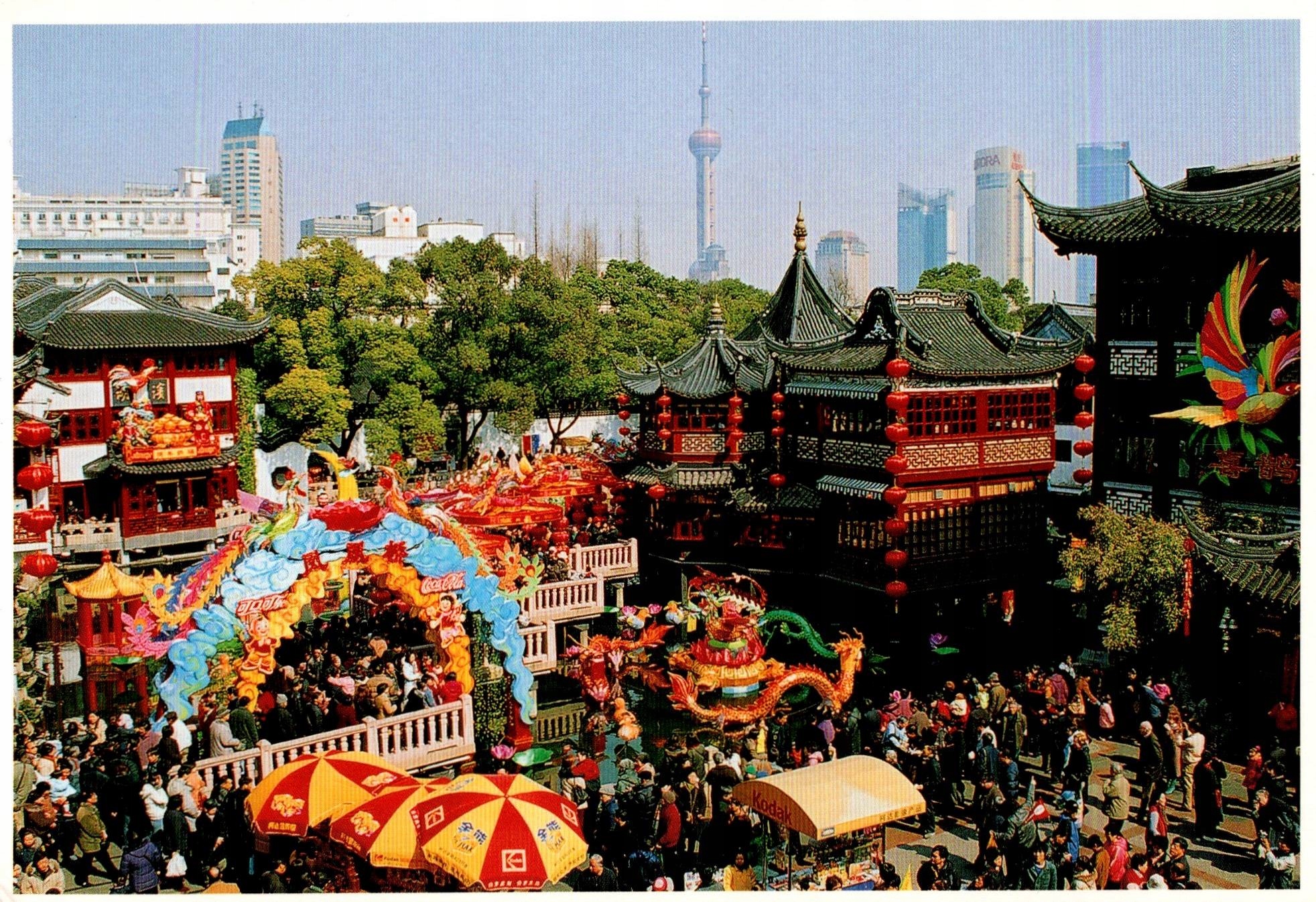 На этой красочной открытке изображено Шоу фонарей, происходящее в знаменитом саду Юйюань в Шанхае — месте, где история, культура и современность встречаются в одном кадре.