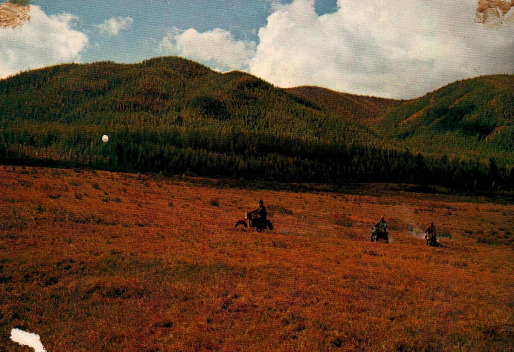 На фотографии изображена широкая равнина с красно-коричневой травой, окруженная нежной, густой травой. лесистые холмы. На переднем плане три человека едут на мотоциклах по степи – их силуэты добавляют динамики и человеческого начала этому дикому пейзажу. На заднем плане — гряда покрытых тайгой холмов, а небо затянуто пухлыми белыми облаками. В верхних углах карточки видны незначительные следы механических повреждений.