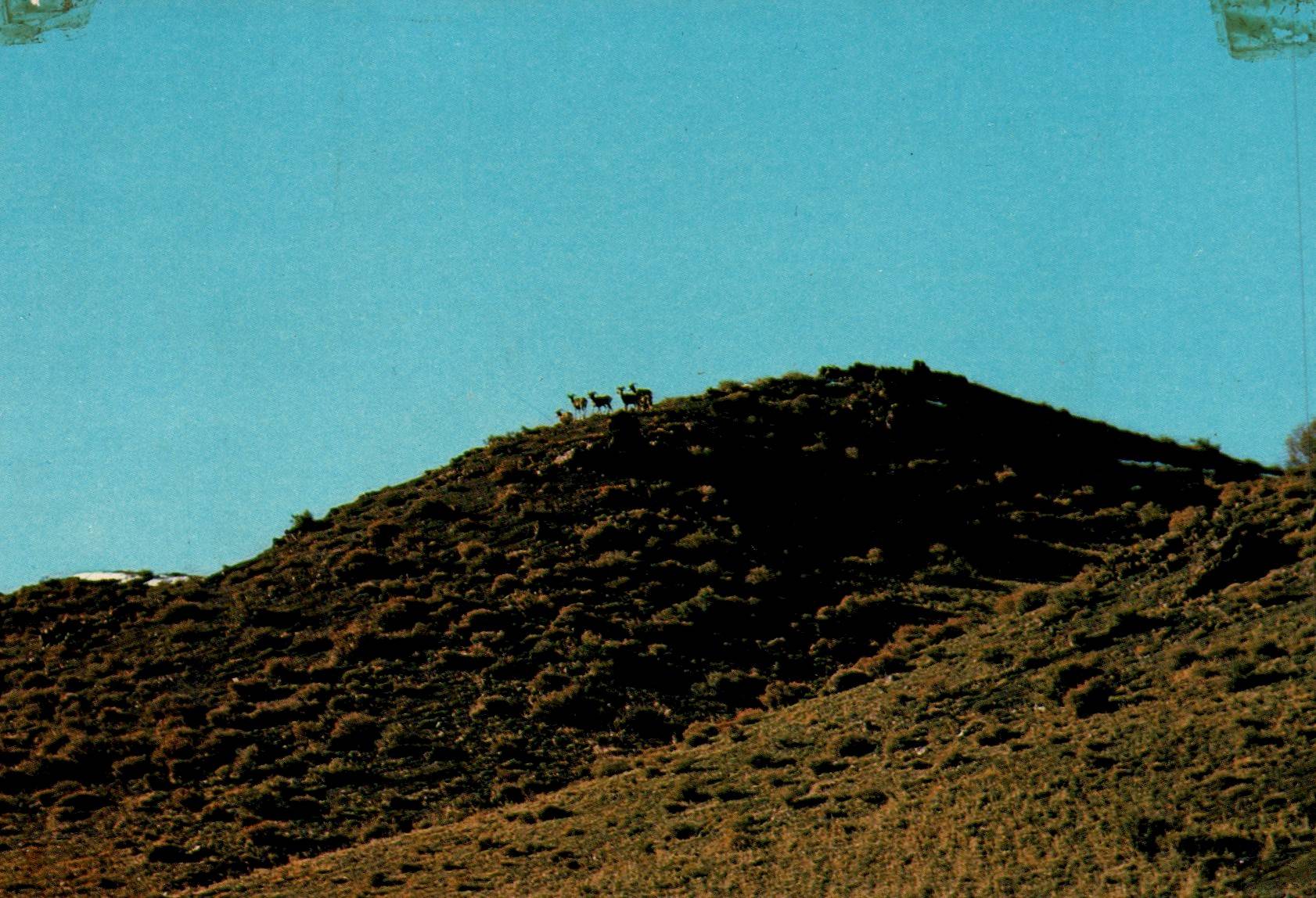 На фотографии изображен темный скалистый склон холма, покрытый невысокой степной растительностью. На его спине, на фоне ясного светло-голубого неба, сидит небольшое стадо диких баранов (скорее всего, архаров), зорко наблюдающих за окрестностями. Животные представляют собой лишь силуэты на фоне неба, что подчеркивает строгость и открытость пейзажа. В верхних углах открытки видны легкие следы потертости или потертости бумаги.