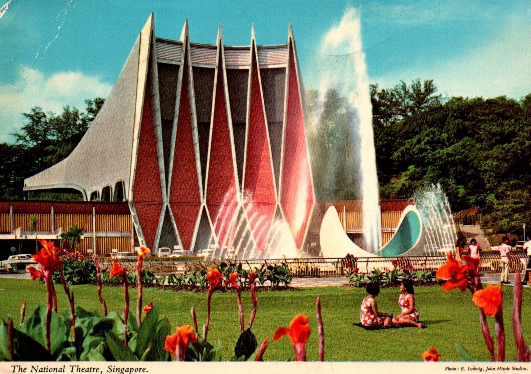 Вид на футуристическое здание Национального театра Сингапура (Национального театра), когда-то расположенного в парке короля Георга V у подножия форта Каннинг-Хилл. Характерная архитектура объекта – треугольные «ребра» крыши – динамично поднимаются вверх, символизируя современность 1960-х годов. На переднем плане эффектно движущийся фонтан и тщательно ухоженные клумбы, на фоне которых две женщины, сидящие на траве, создают элемент релаксации.