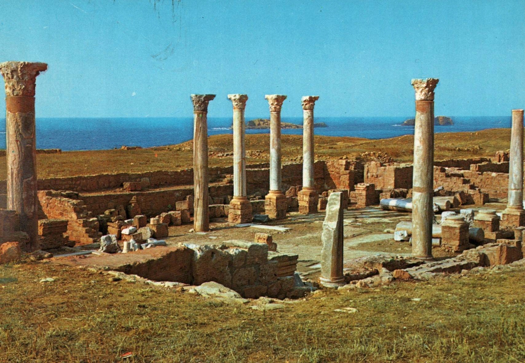 Надчата представляет останки древнего города Аполлония , расположенная на средиземноморском побережье в Киренеке (текущий Ливия). На переднем плане вы можете увидеть руины древнего комплекса с характерными колоннами о коринфских столицах, которые являются частью бывшего порта и греко-римских храмов. На заднем плане с островками есть голубые моря, подчеркивая монументальность места и его историческое значение как порт древней Кирена.