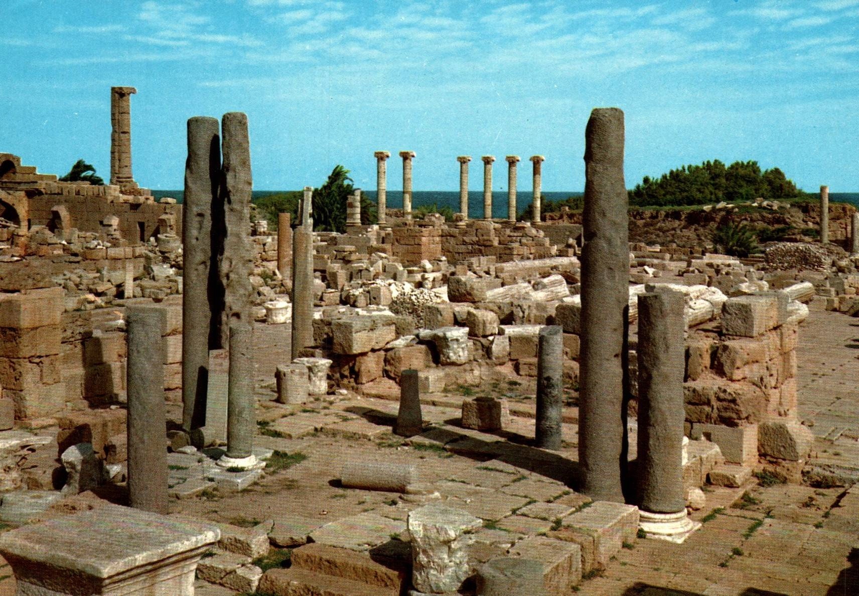 Местоположение: Leptis Magna (Lepsc Magna), археологическое положение, расположенное на Средиземном море, недалеко от Аль-Чумса, Liby Руины древнего города Лептизис Магны-одного из лучших представленных рискованных рисунков. Мы видим фрагмент форума и окружающих колоннадов, с характерными колоннами, разбросанными в космосе - свидетелями веков истории и бывшего великолепия города. Фон - синий из моря и сочный зеленый цвет средиземноморских растений, создавая контраст для песчаника руин. Место исходит молчание и величество, передавая получателя во времена императора Сепмиуса Севера, который пришел отсюда.