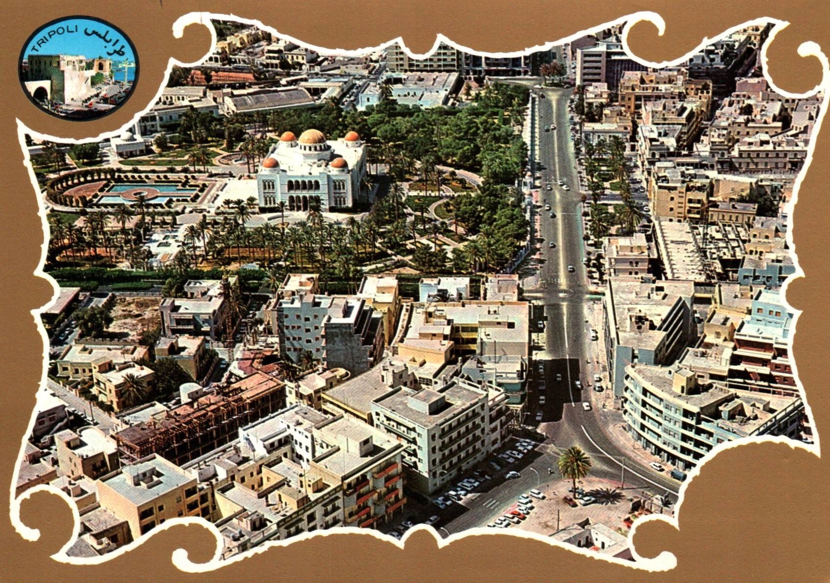 открытка представляет панорамный вид центра Ливии, в котором преобладает Омар Эль Мухтар - одна из главных артерий столицы Ливии. Взгляд птичьего глаза отражает город на рубеже 1960 -х и 1970 -х годов, показывая как современные средиземноморские здания, так и пышную городскую зелень. Целью рамы является характерное белое здание с куполами, окруженное обширным парком и фонтанами - бывшим национальным музеем. Припаркованные автомобили и компактные фасады городских жилых домов и офисных зданий видны вдоль широкого проспекта. Пейзаж отражает атмосферу развивающегося города во время модернизации городской Ливии.
